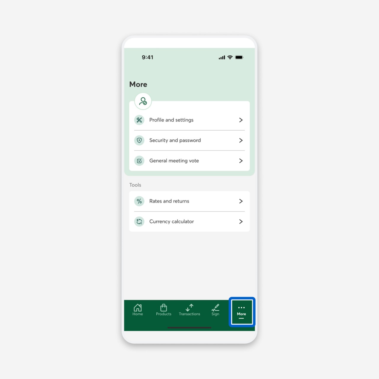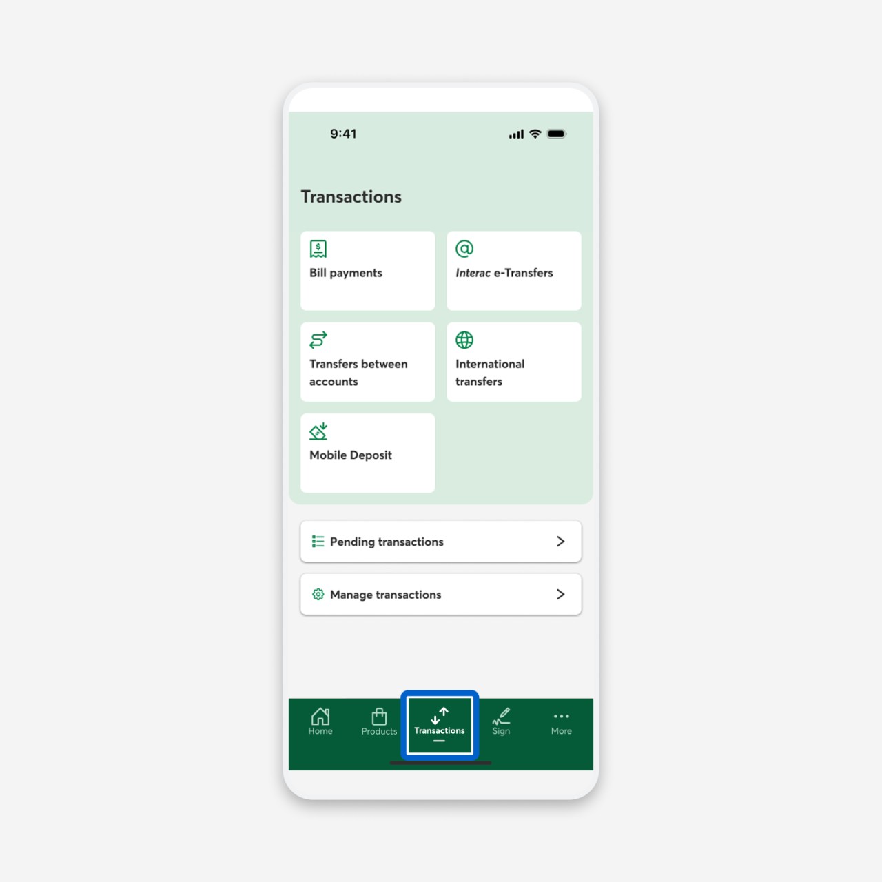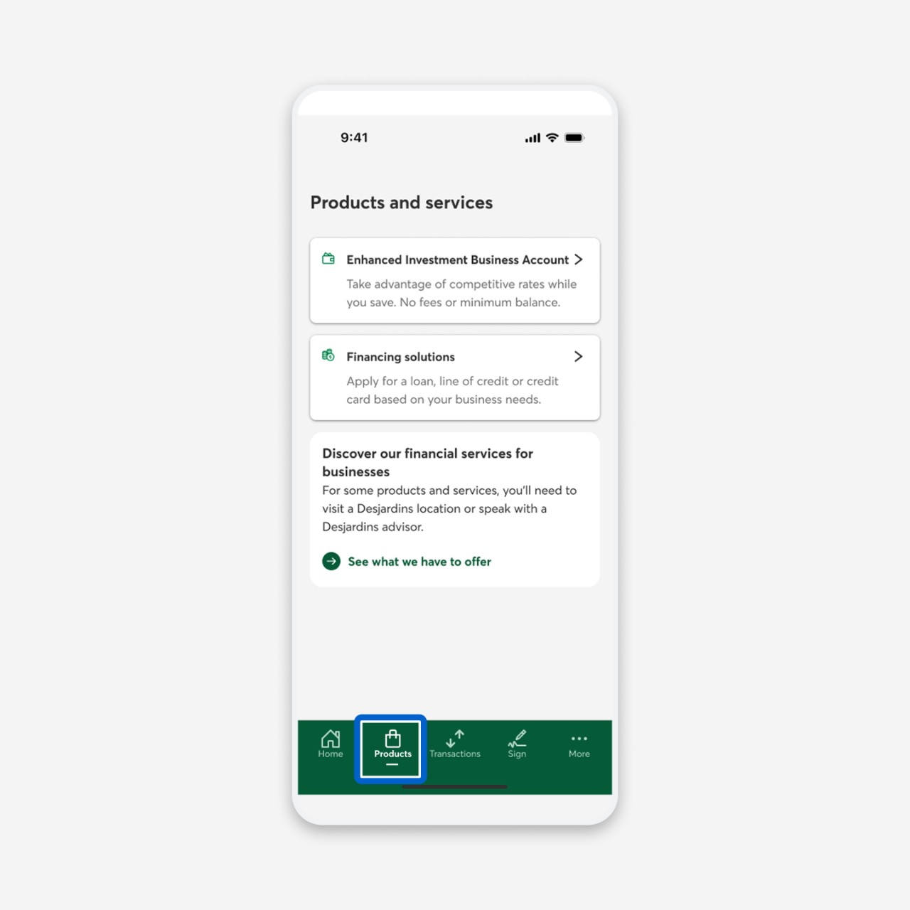 To get around in the Desjardins mobile services app, use the navigation bar at the bottom of your screen. It has 5 tabs that let you quickly access all the features you need to manage your business finances.