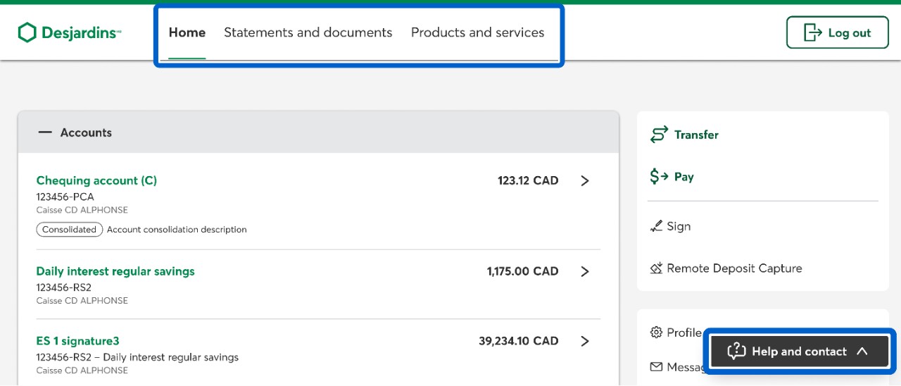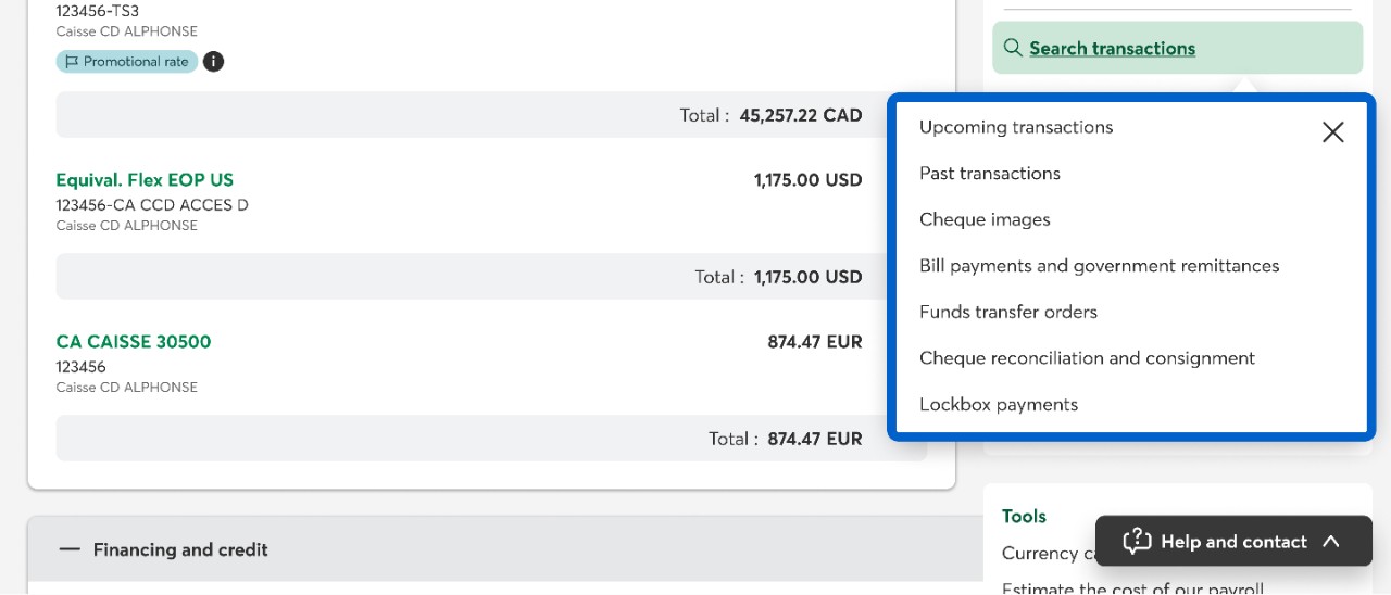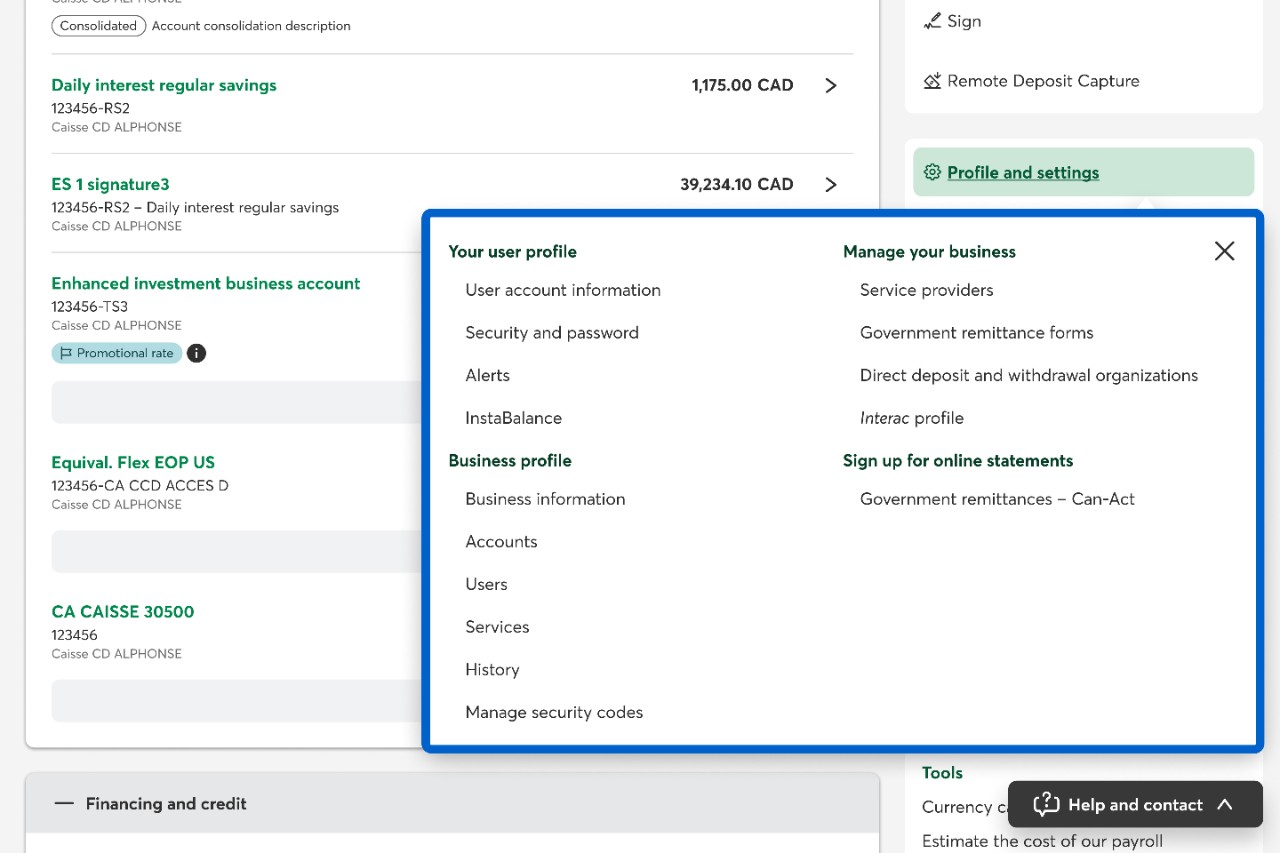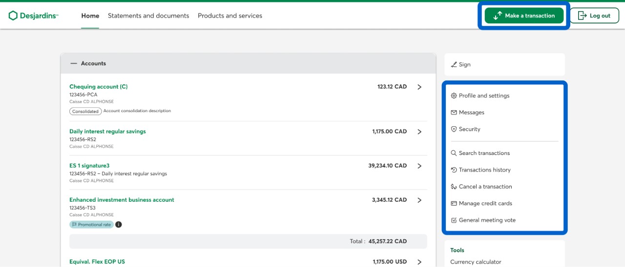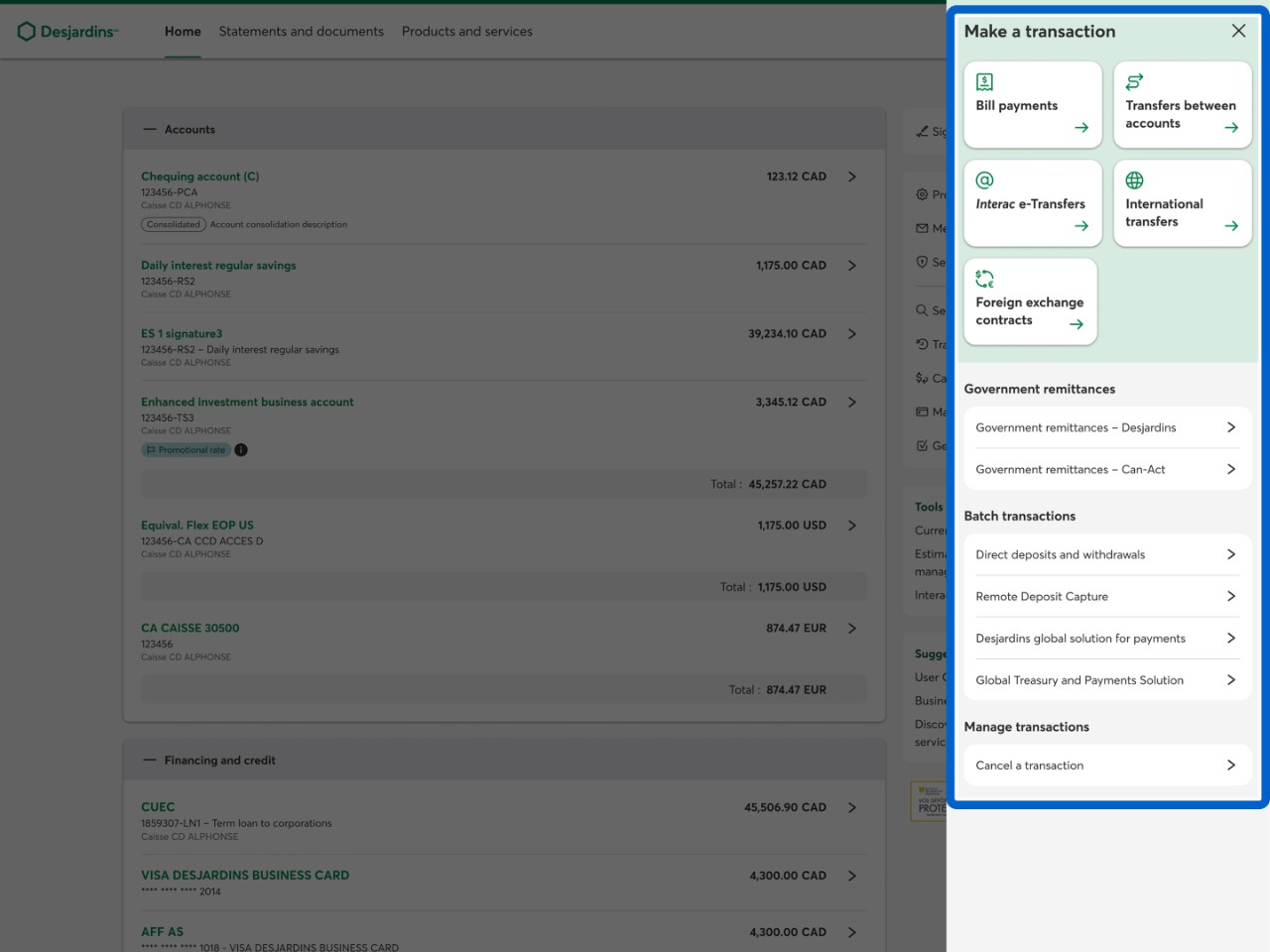 To get around on AccèsD Affaires in a web browser, use the Make a transaction button or the menu on the right-hand side of the home page. They give you quick access to the features you need to manage your business accounts.