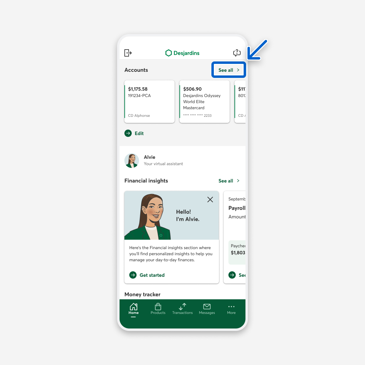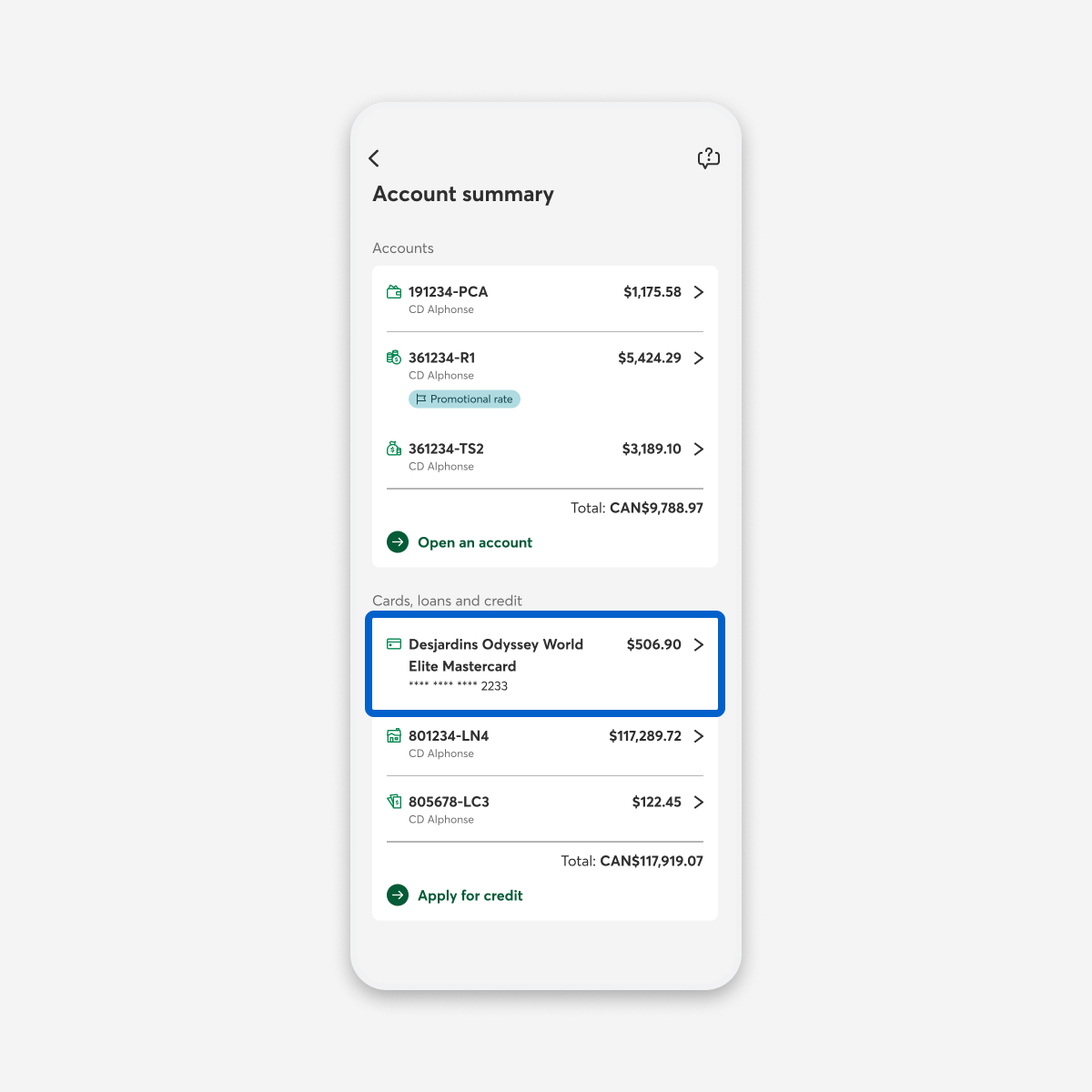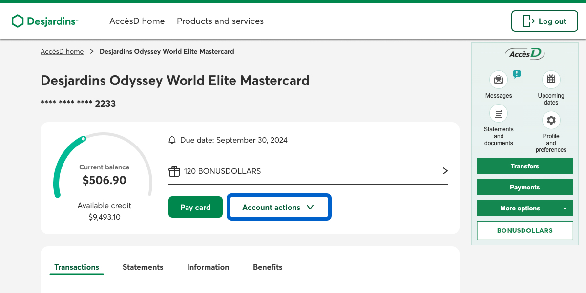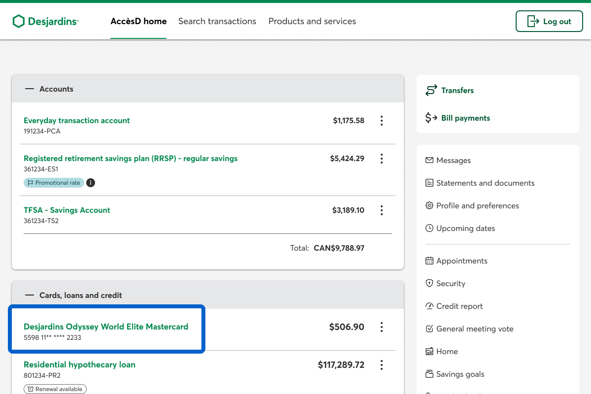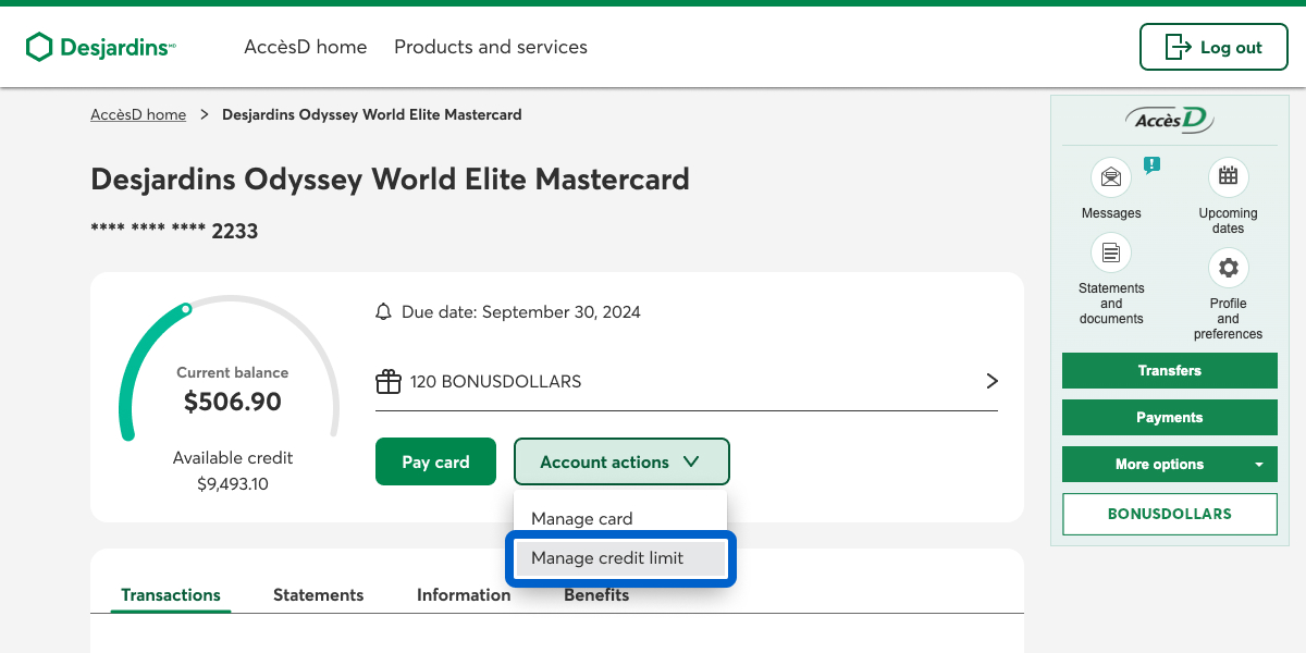 On the AccèsD home page, under Cards, loans and credit, select the credit card whose credit limit you want to manage.