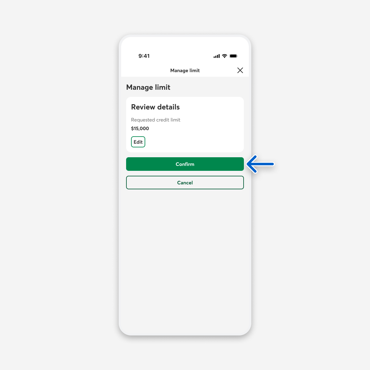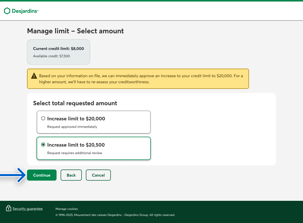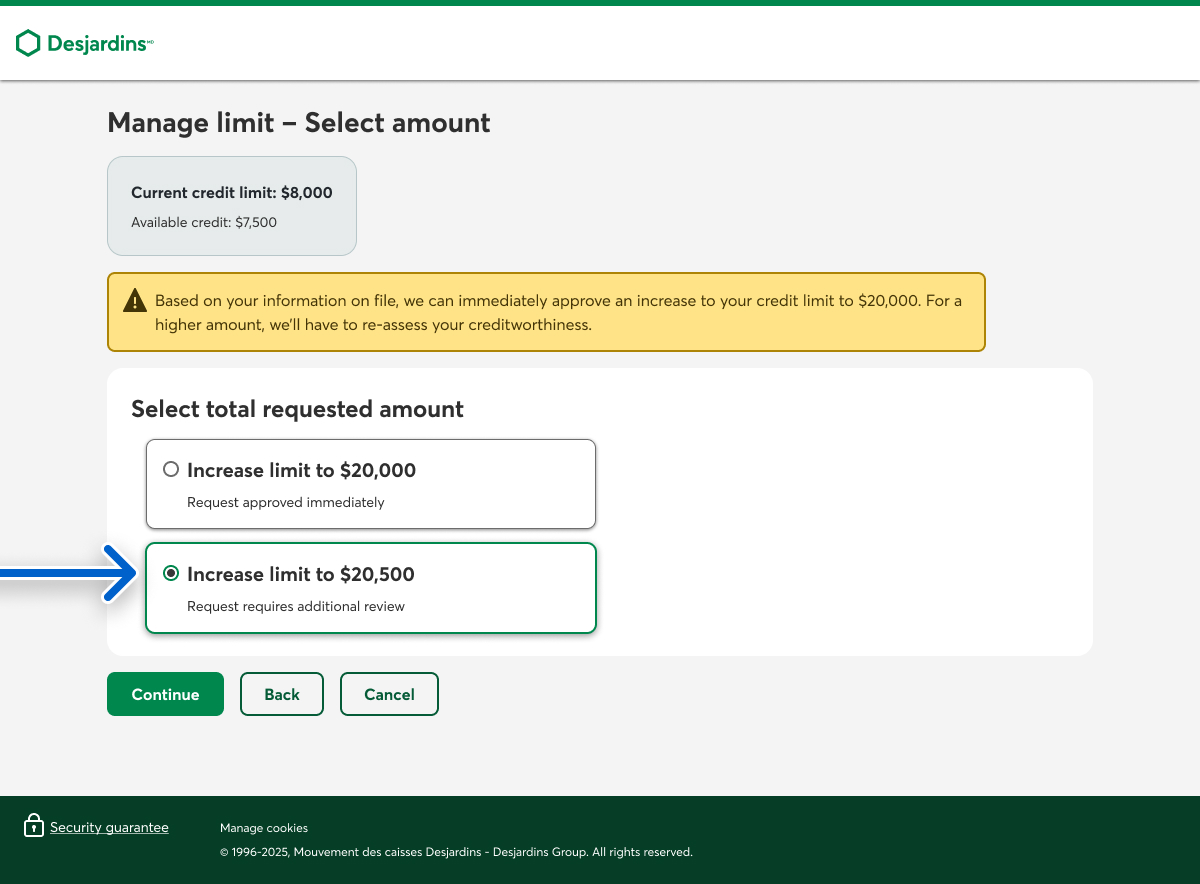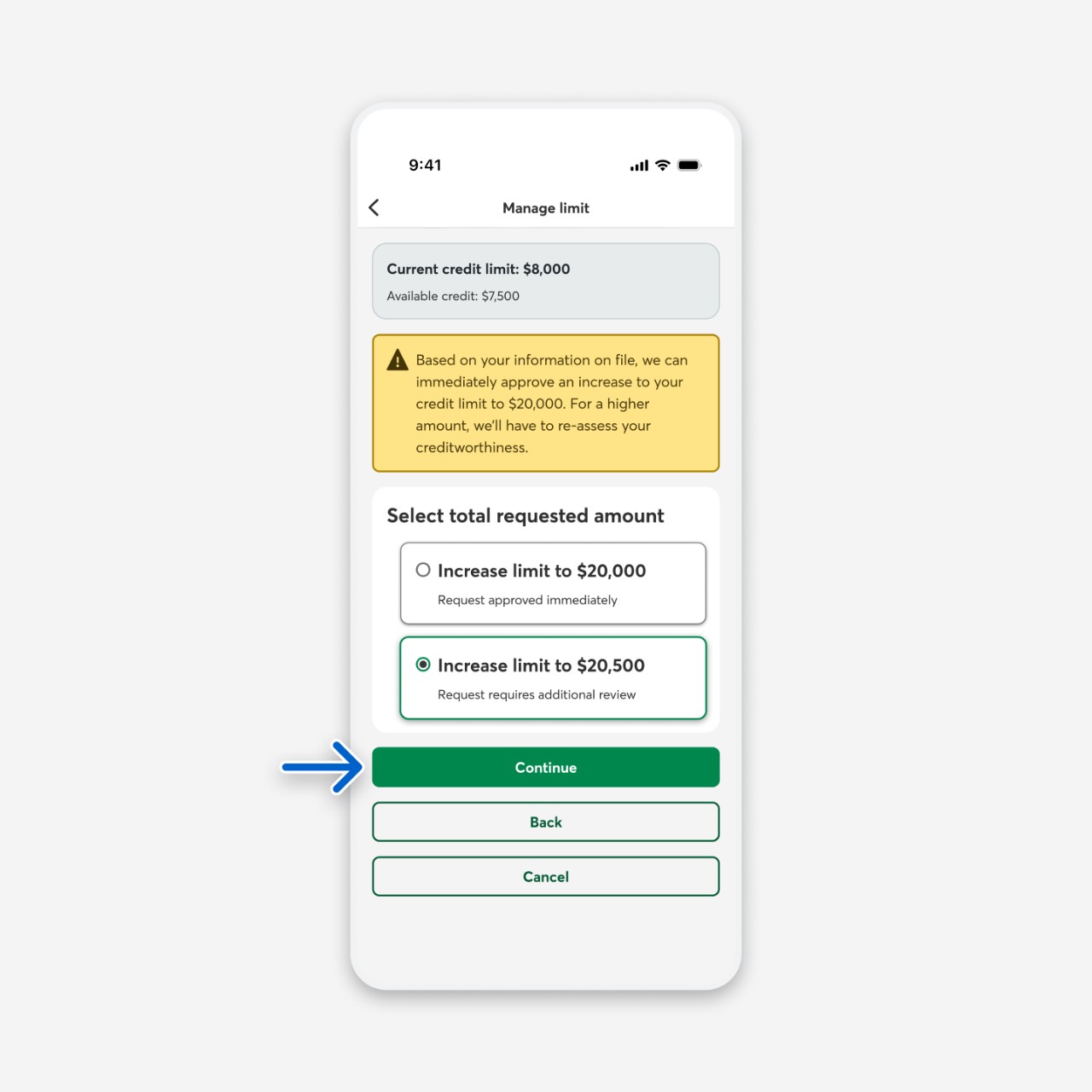 On the Manage limit – Select amount page, if you’ve been approved for a higher limit, the Select total requested amount section appears. You can select the proposed limit that we’ve already approved, or a higher limit that will require further review.
