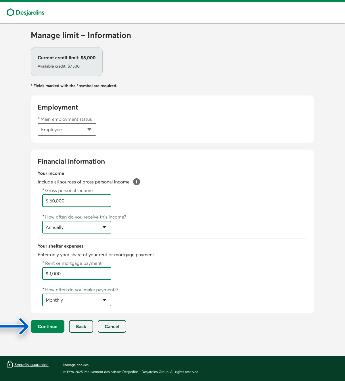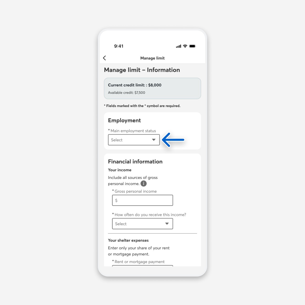 On the Manage limit – Information page, under Employment, select your main employment status from the dropdown list.