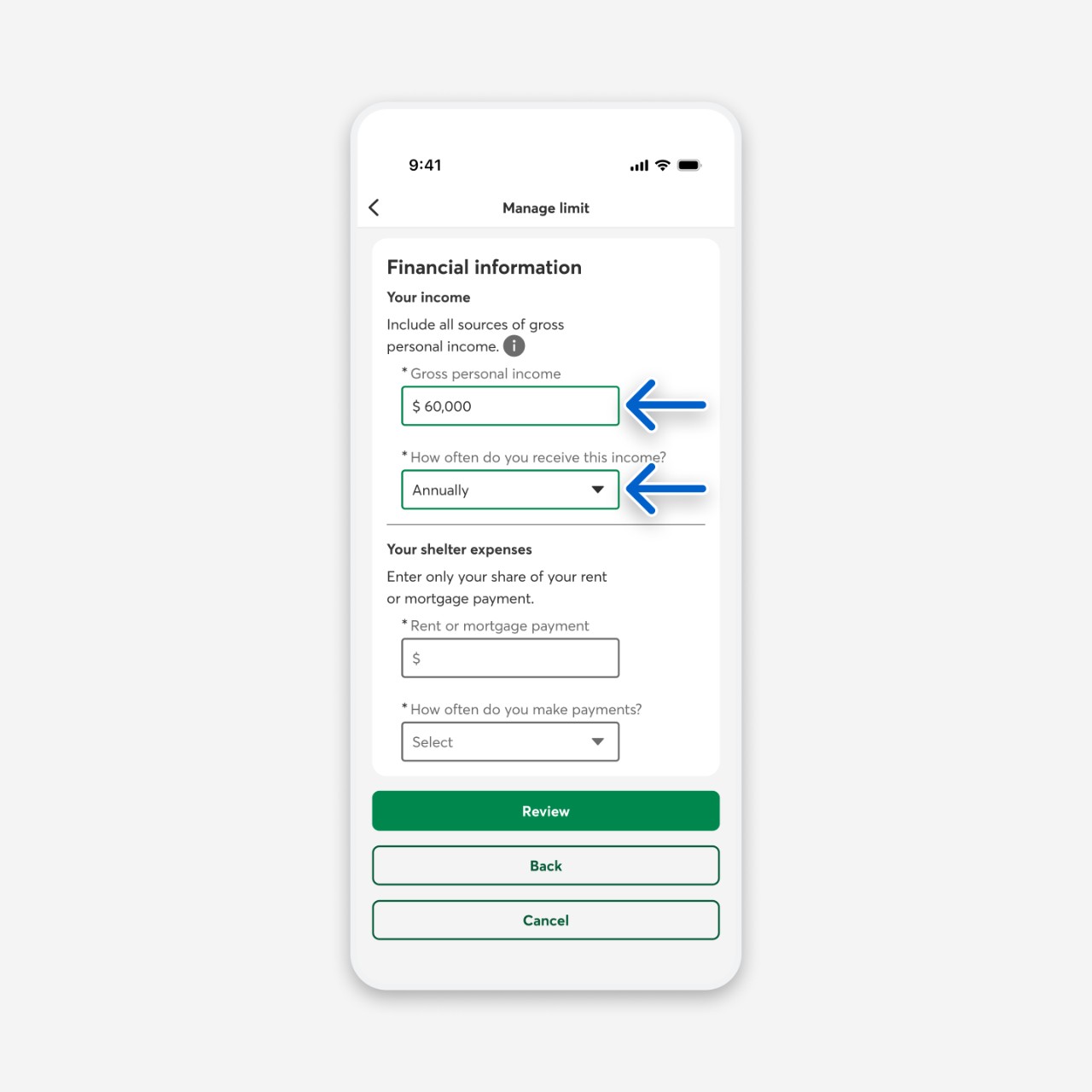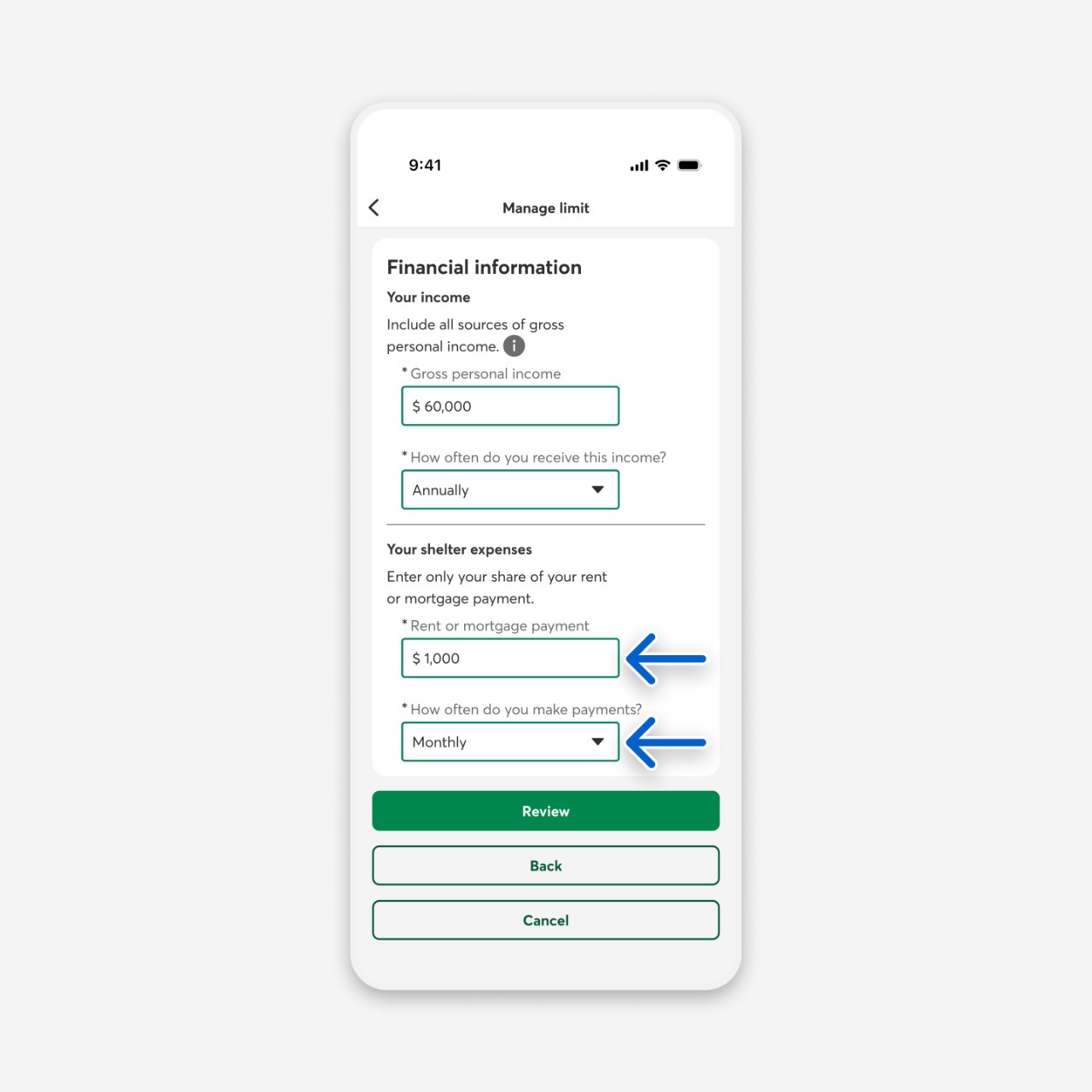 On the Manage limit – Amount page, enter the new limit you want and select the Review button.