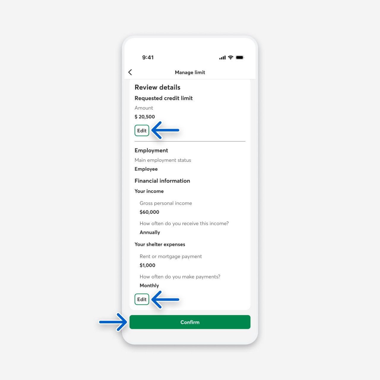 Learn how to manage your credit card’s credit limit using our mobile and online services if you’re the sole cardholder. If you’re a joint cardholder, call us to make your request.