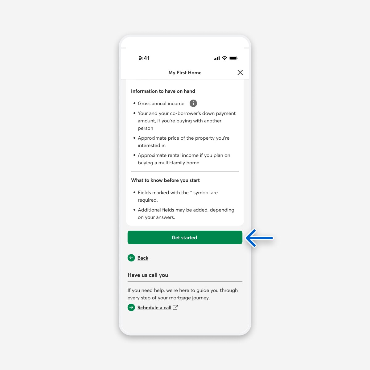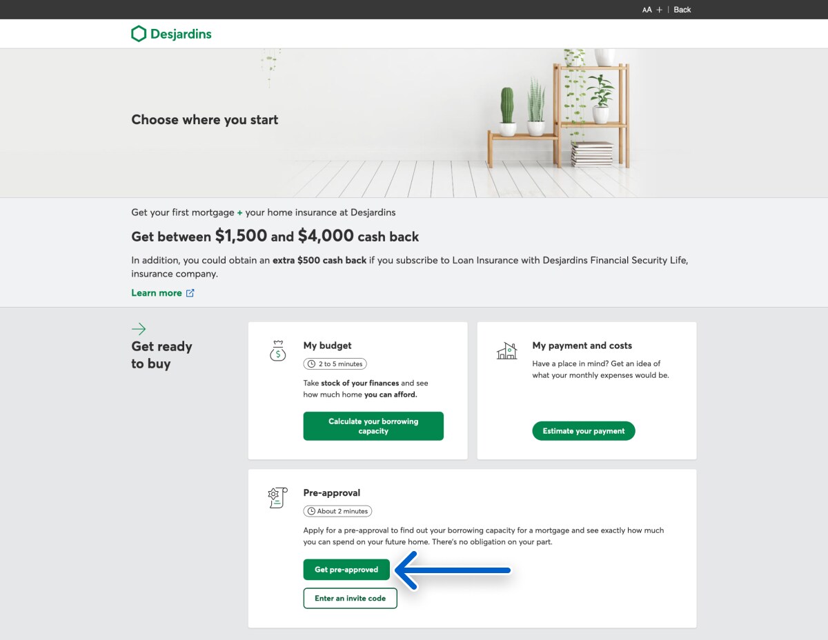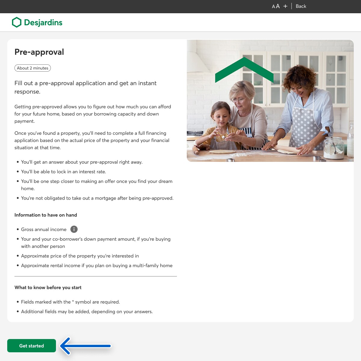The Pre-approval page opens. Select the Get started button and answer the questions to apply for pre-approval.