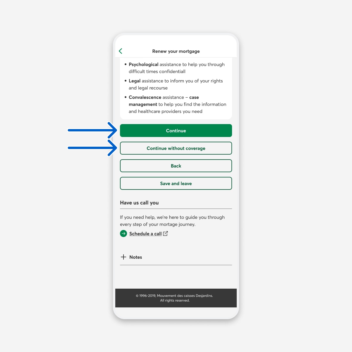 Choose the Continue button if you want to take out loan insurance, or choose the Continue without coverage button. If you’re taking out loan insurance, follow the instructions for getting loan insurance before the next step, which is choosing your mortgage payment options.