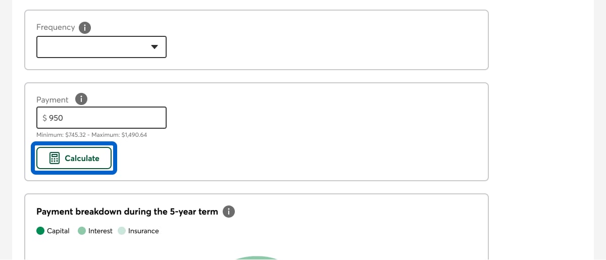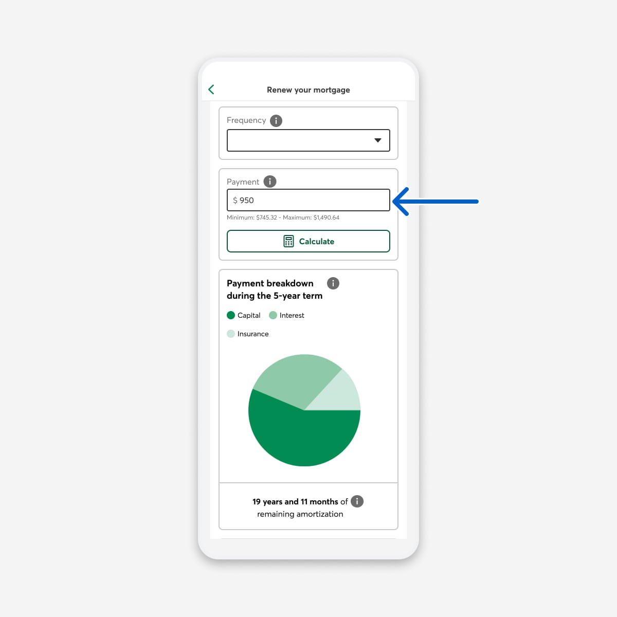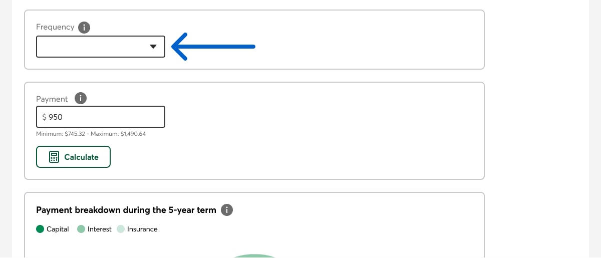 If you want to change your current payment frequency, in the Choose your payment amount step, go to Frequency and select an option from the dropdown list.