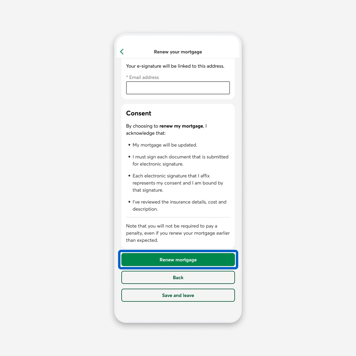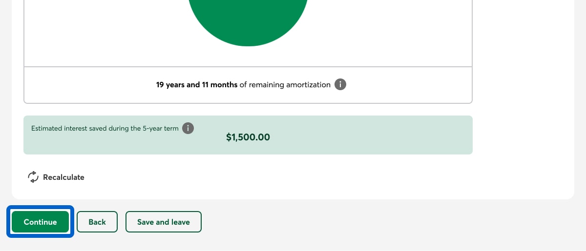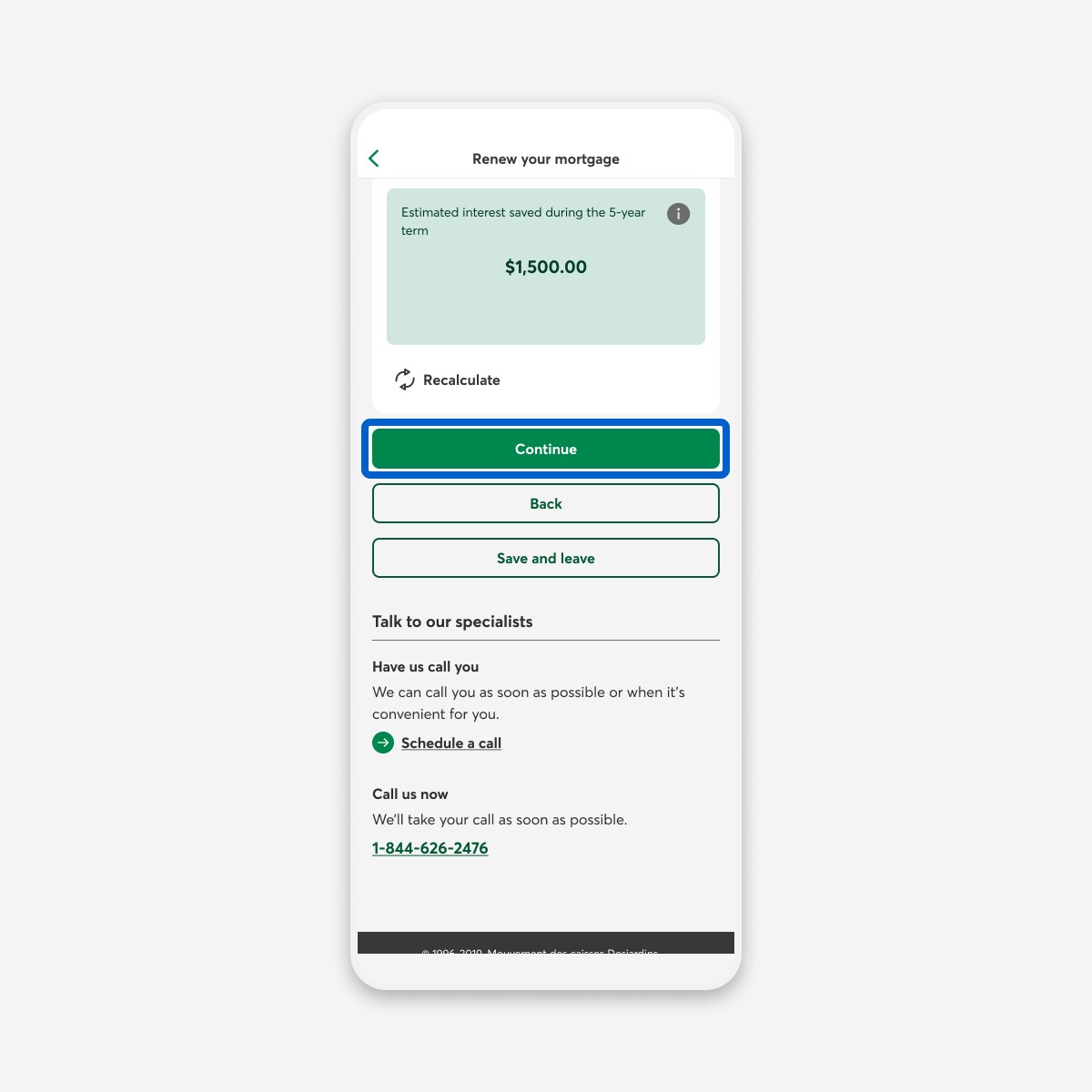 On the Mortgage renewal – Rates page, in the Choose your personalized rate step, find the rate option you want then choose the Select and continue button.