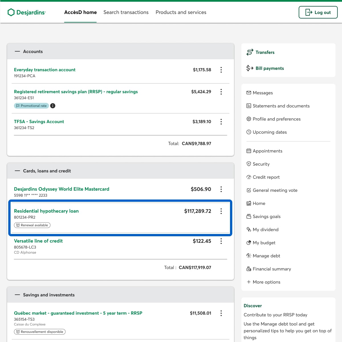 On the AccèsD home page, under Cards, loans and credit, select the mortgage that’s up for renewal.