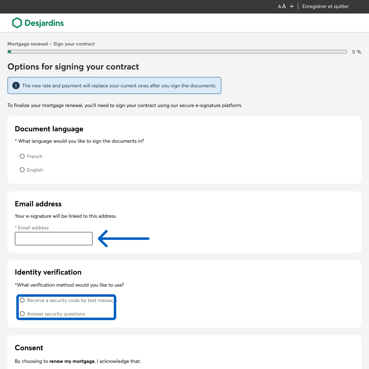 Enter the email address you want us to send the contract to. If you need to confirm your identity, the Identity verification section appears. Choose a verification method and enter the required information.