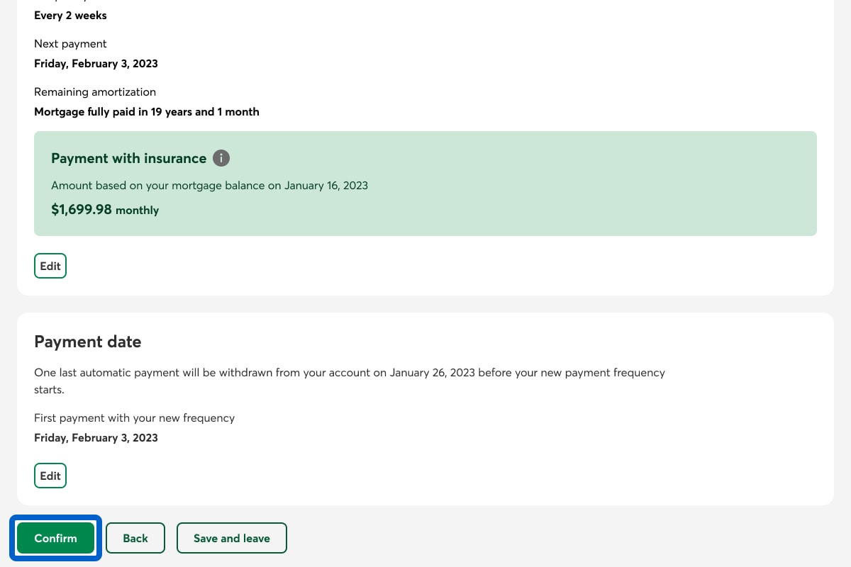 If you chose a new payment frequency, select the start date of the first payment, then select the Continue button.