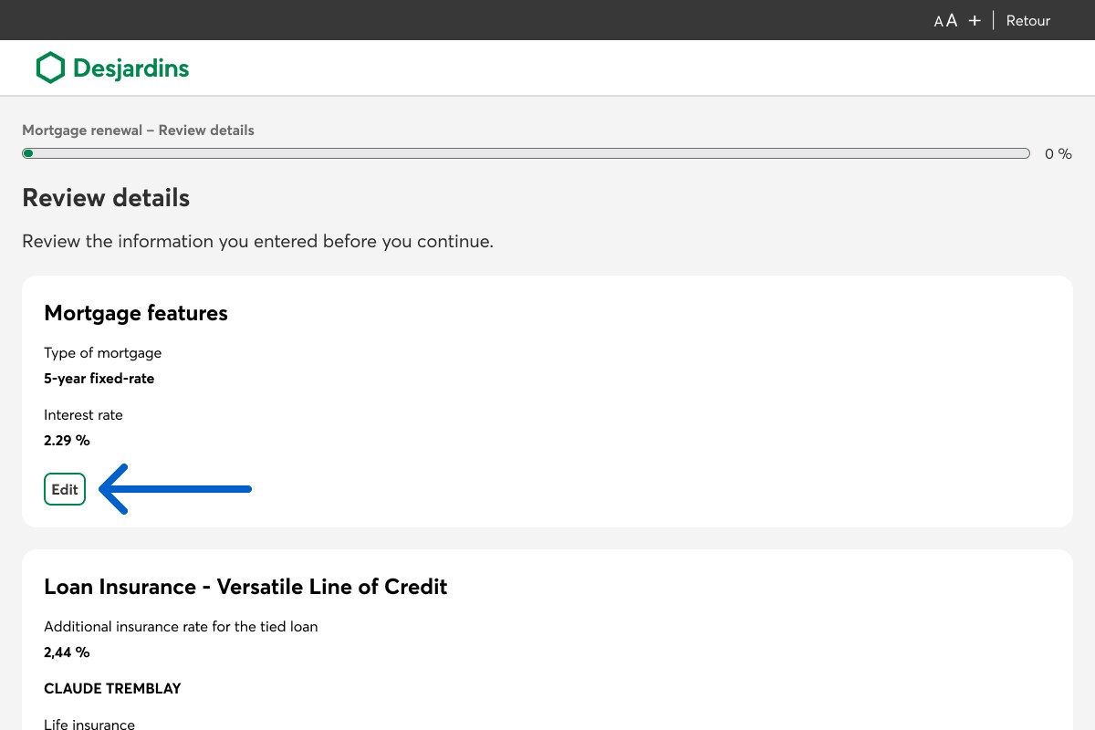 In the Review details step, make sure all the information is accurate. To change something, select the Edit button. If your co-borrower selected the rate and payment options, make sure they are correct. You can change them by selecting the Change renewal details button.
