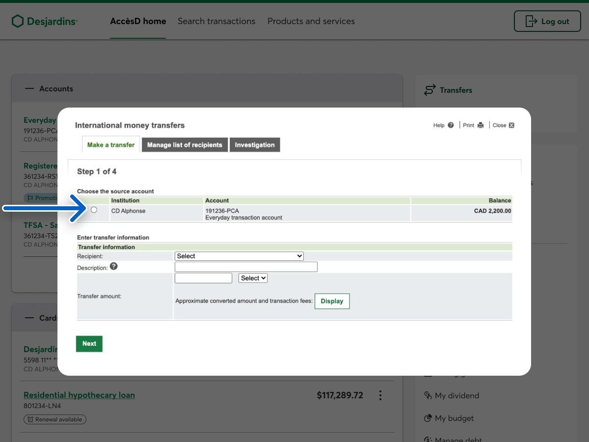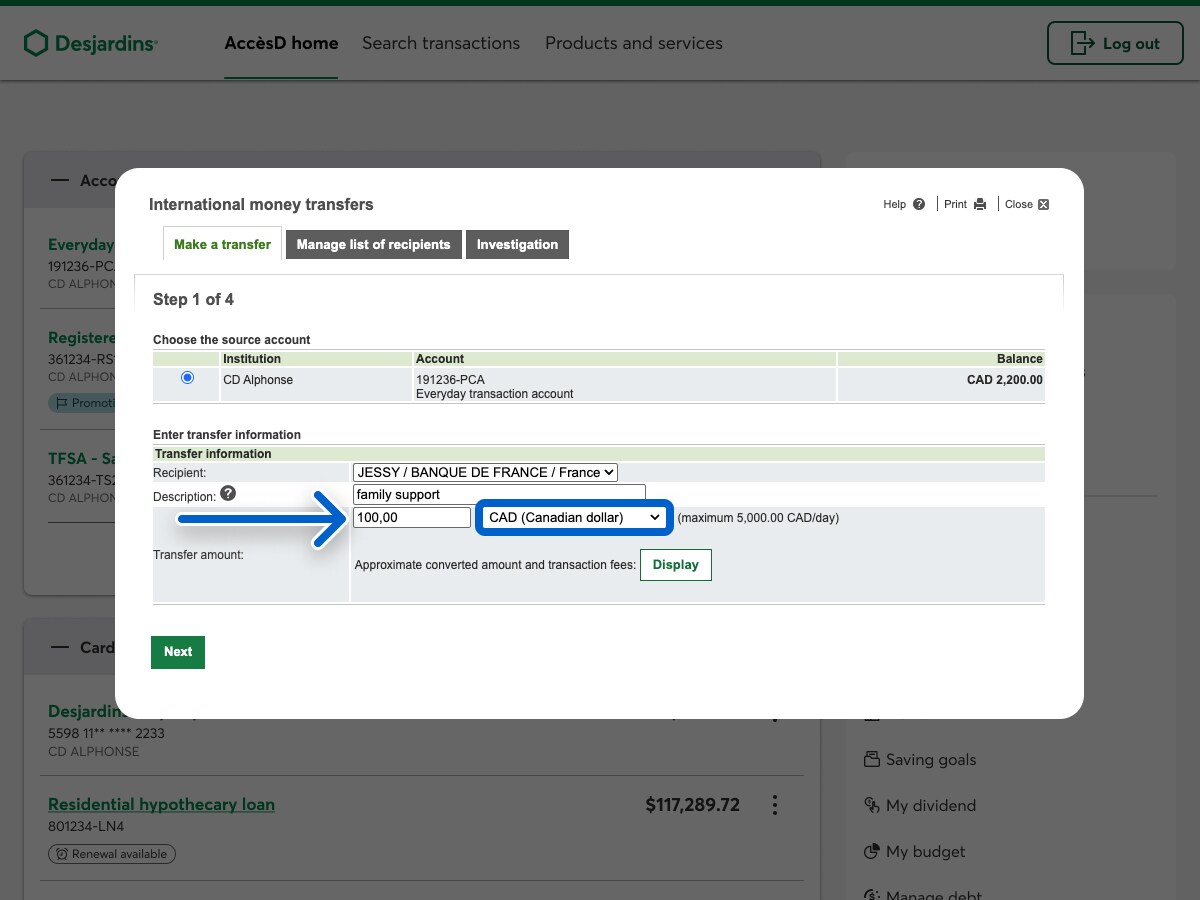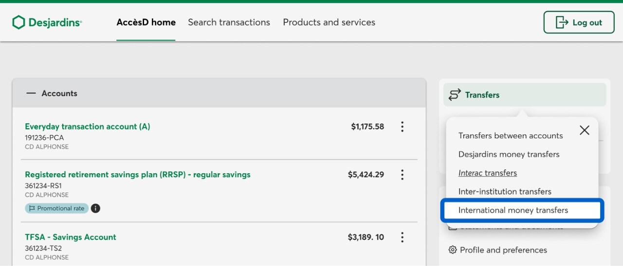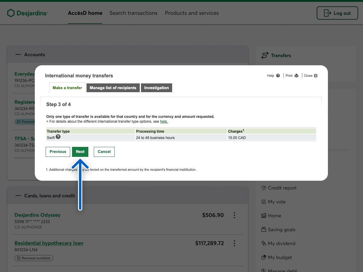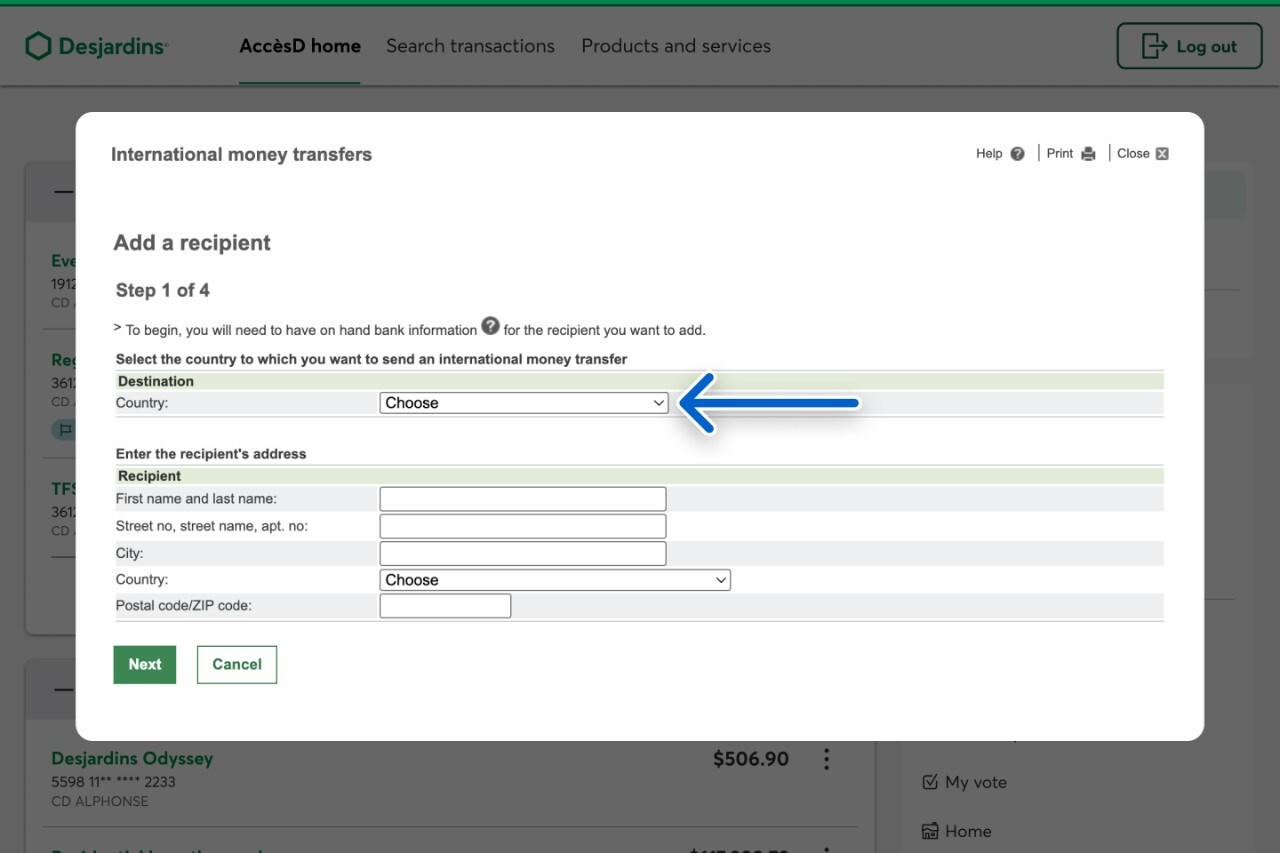 Learn how to send an international money transfer on AccèsD. This feature is not yet available in our mobile app.