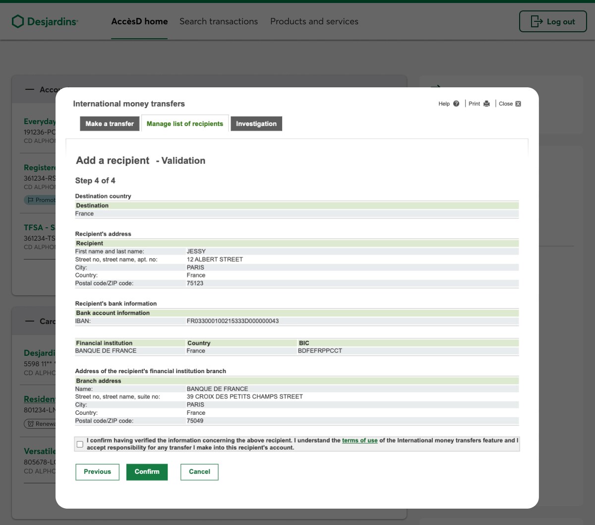 On the Validation page, double-check all the information for the transfer, select the box to accept the terms of use, then select the Confirm button to send your transfer.
