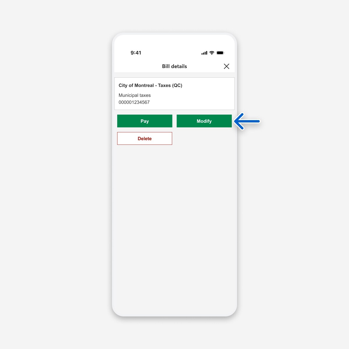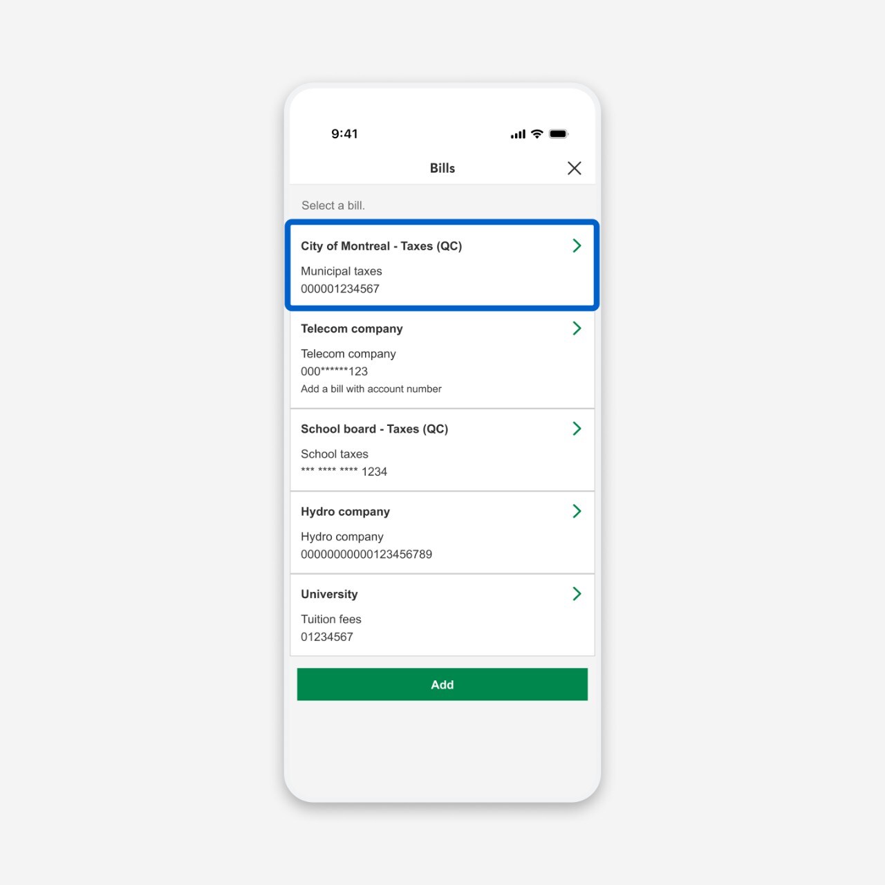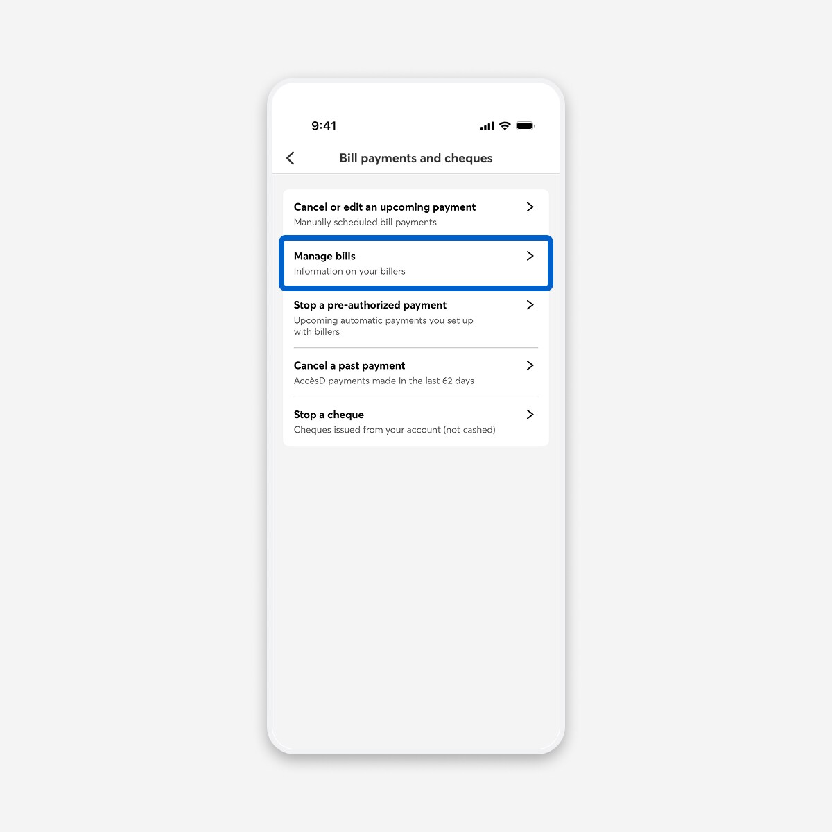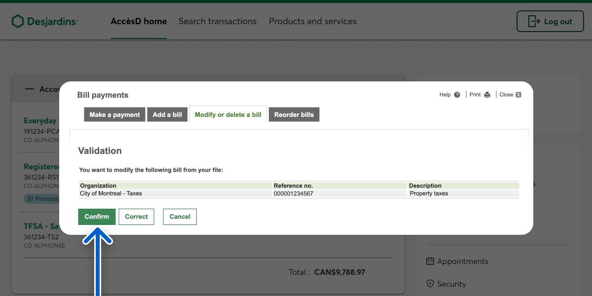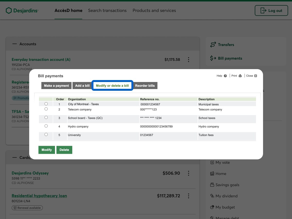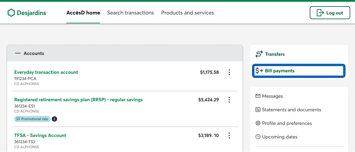 Log in to AccèsD. On the home page, select the Bill payments button.