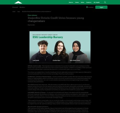 - Topic: Press releases Desjardins Ontario Credit Union honours young changemakers March 16, 2026