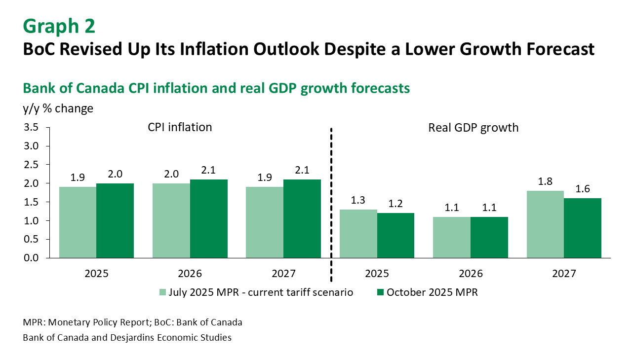 - Second, while economic weakness is holding back price increases, the trade conflict is adding to the costs facing businesses, thereby putting upward pressure on inflation. The BoC expects these factors to broadly be a wash, keeping inflation to around 2% over the outlook. That said, the Bank revised up its outlook for inflation slightly compared to the July MPR (graph 2).