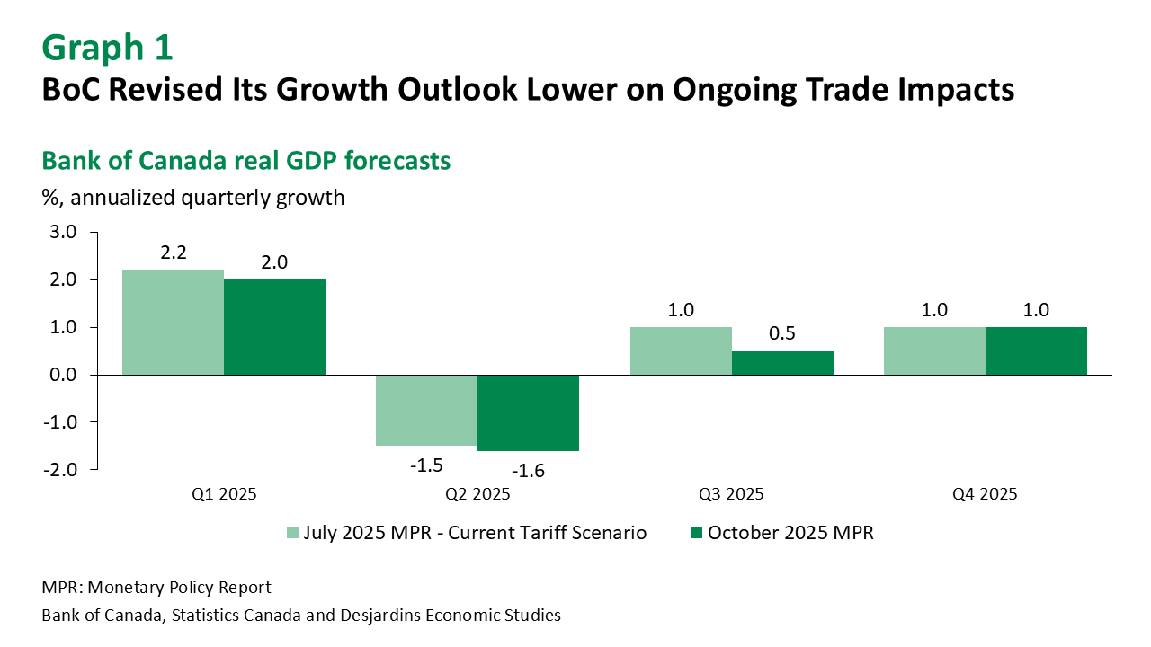 - First, the Canadian economy has been weakened by US tariffs and trade policy uncertainty, and that is expected to weigh on growth through the remainder of the year. The labour market is soft. The Bank’s forecasts for real GDP growth in the second half of the year has been marked down from that in the July 2025 Monetary Policy Report’s (MPR) current tariff scenario (graph 1). The BoC has kept its sluggish outlook for 2026 largely unchanged.