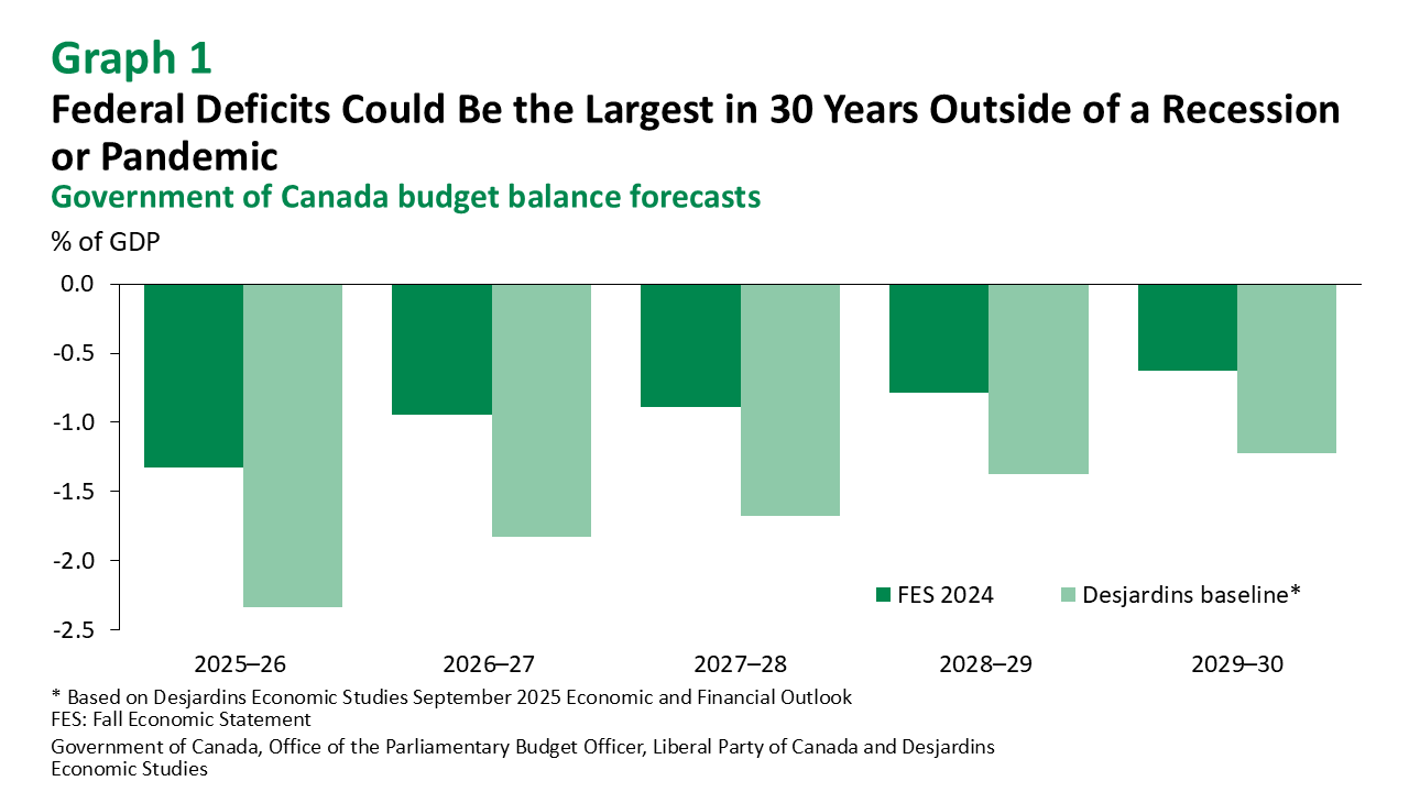 - After a long delay, the 2025 federal budget is finally coming on November 4. While it’s difficult to know exactly how big the planned deficits will be, announced spending and tax cuts make clear that they will be among the largest in recent memory as a share of GDP outside of a recession or pandemic (graph 1).