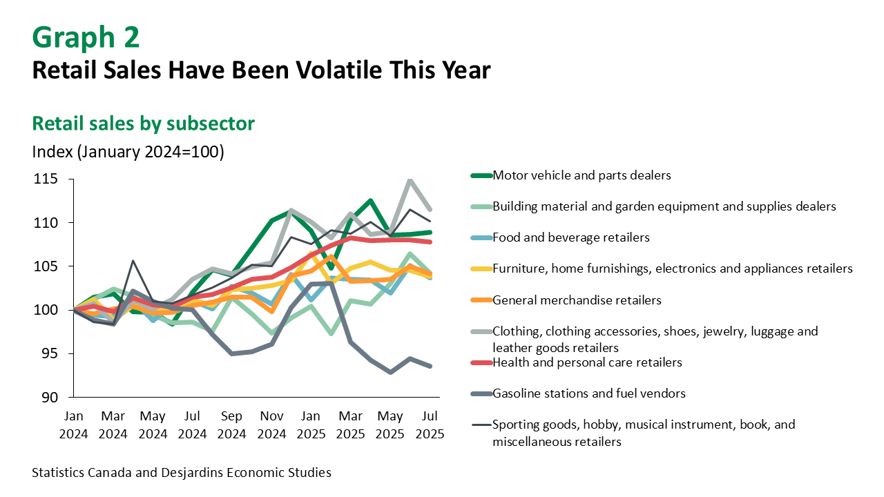 July’s widespread decline in retail sales is not entirely surprising in the current economic environment, marked by trade uncertainty and subdued consumer confidence. But it should also be put in the context of solid advances in June and (most probably) August. In fact, retail sales have displayed high monthly volatility this year (graph 2). The more worrying trend concerns core sales, which have declined in three of the last four months. Momentum also appears to have faded in autos since May. In the coming months, we expect slowing population growth, a sluggish job market and stretched household finances to limit the advance of retail sales.