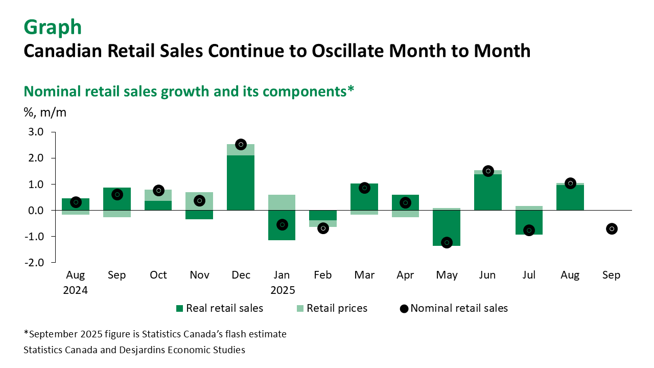 - Statistics Canada’s preliminary estimate points to a decrease of 0.7% in September retail sales. If that proves correct, volumes likely dropped by 1.4%, given goods prices rose 0.7% over the month.