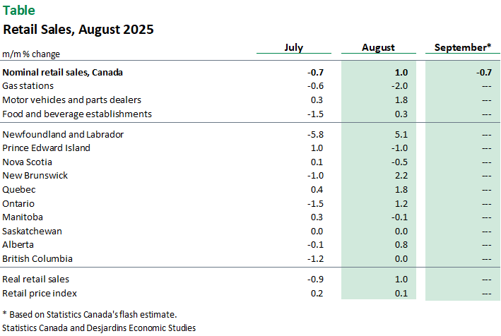 - Retail sales rose by 1.0% m/m in August, in line with the consensus of economists and Statistics Canada’s flash estimate (see table for details).