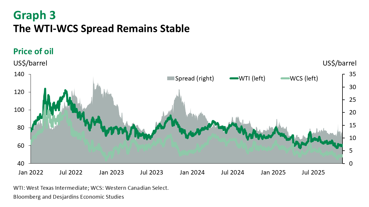 Canadian producers are managing to navigate tariffs and the resulting uncertainty for now. The CUSMA compliance rate for oil exports to the United States is over 96%, allowing Canadian oil to enter the market tariff-free. Despite a temporary drop in production of 0.3 MMb/d in September due to facility maintenance, Canadian oil output is expected to grow 3.3% this year and 1.7% in 2026. However, Canadian exports have declined since the beginning of the year (-11.4%), mainly due to lower shipments to the United States (-13.1%). Deliveries to China—now possible via the TMX pipeline—only offset about 10% of this loss. These lower trade volumes are keeping the WTI/WCS (Western Canadian Select) spread close to US$11 per barrel (graph 3).