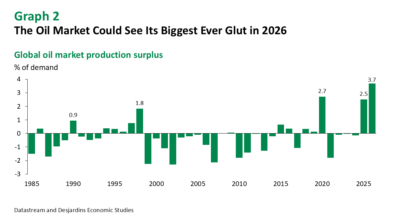 Global oil production was up 5.6 MMb/d year over year in September. This spike in output, 55% of which came from OPEC+, should generate the largest market surplus since the pandemic, with excess supply equal to 2.5% of demand in 2025 (graph 2). That said, we may break the record set in 2020 next year, when the market surplus could reach about 3.7% of demand. Although this glut has been in the forecast for several months now, and the supply trajectory remains in line with expectations for next year, crude prices have remained in the US$60–70 per barrel range until recently. This stability is partly due to the global economy’s resilience in the face of the trade war, and a degree of doubt as to whether these forecasts will materialize. However, fundamental changes in the structure of the oil market are also behind the current price levels.