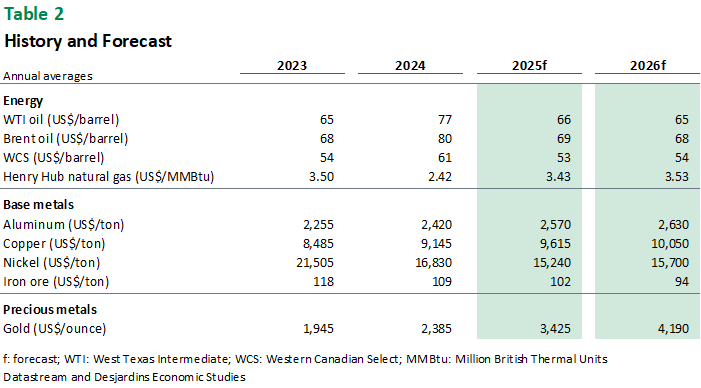 Despite the situation, commodity prices are holding up. Base metal prices are benefiting from surprisingly resilient global industrial production (graph 1). The price of gold skyrocketed before edging back down. We expect gold to continue to rise in the coming quarters. Oil prices have dipped recently, but they remain relatively stable as the market prepares for its biggest surplus since the pandemic. Agricultural commodity prices are fairly flat, while US trade policy is contributing to lumber price volatility.