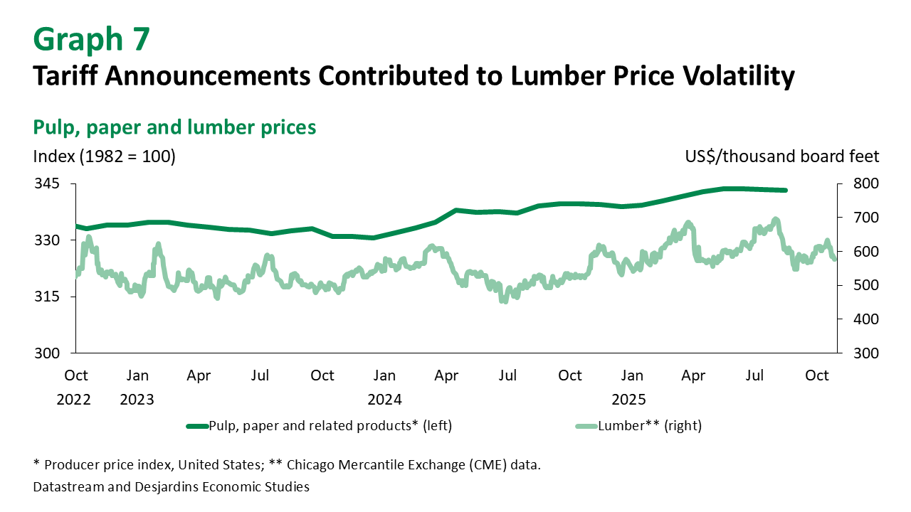 The Canadian forestry sector faced considerable uncertainty throughout the year. Erratic tariff announcements contributed to fluctuations in softwood lumber prices (graph 7). In mid-August, countervailing and anti-dumping duties doubled to 35%, followed by an additional 10% tariff imposed on October 14, bringing the total to 45%. This basically eliminated the historical comparative advantage of Canadian softwood in the US market. European competitors are capitalizing on this opportunity to expand their market share in the United States. Weak US housing starts have put downward pressure on lumber prices, compounded by a recent spike in US production of southern yellow pine. But this type of lumber, grown in the southern United States, lacks the structural strength of northern softwoods, including those from Canada, making it an imperfect substitute for house framing.