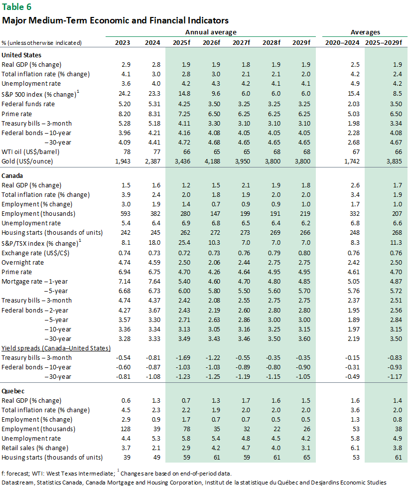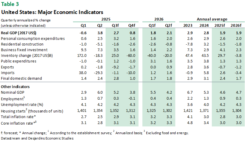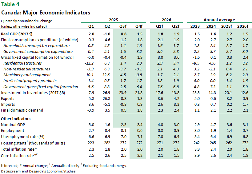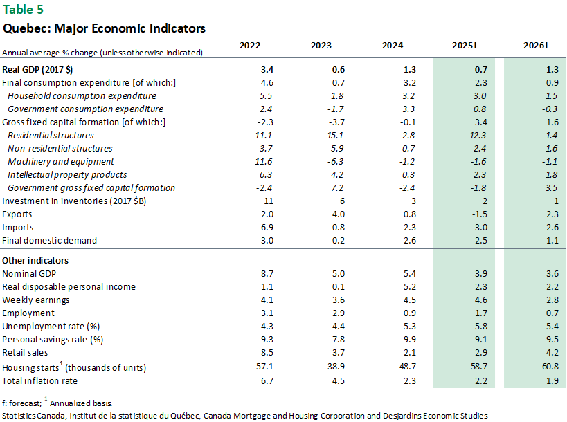 - For Quebec, resilient domestic demand in Q2 could give way to more limited gains over the rest of the year—high‑frequency data suggest that household contributions may have hit a ceiling, albeit a relatively high one. The overall outlook remains largely unchanged from last month, as the most recent data confirms that the housing market, government spending and non-residential investment have all evolved as expected. Exports, however, may not have performed quite as well as anticipated. While the data we have is partial, given the ongoing US government shutdown, it does appear that Quebec’s exports south of the border have recovered more slowly than initially hoped. As a result, our forecasts for international export growth have been slightly downgraded for the rest of 2025. This revision is further justified by the recent sector-specific tariffs on furniture manufacturers, trucks, buses and lumber. We now expect real GDP growth of 0.7% for 2025, down from 0.8%. Our forecast for 2026 remains unchanged at 1.3%. External link.as the most recent data confirms that the housing market, government spending and non‑residential investment have all evolved as expected. Exports, however, may not have performed quite as well as anticipated. While the data we have is partial, given the ongoing US government shutdown, it does appear that Quebec’s exports south of the border have recovered more slowly than initially hoped. As a result, our forecasts for international export growth have been slightly downgraded for the rest of 2025. This revision is further justified by the recent sector‑specific tariffs on furniture manufacturers, trucks, buses and lumber. We now expect real GDP growth of 0.7% for 2025, down from 0.8%. Our forecast for 2026 remains unchanged at 1.3%.