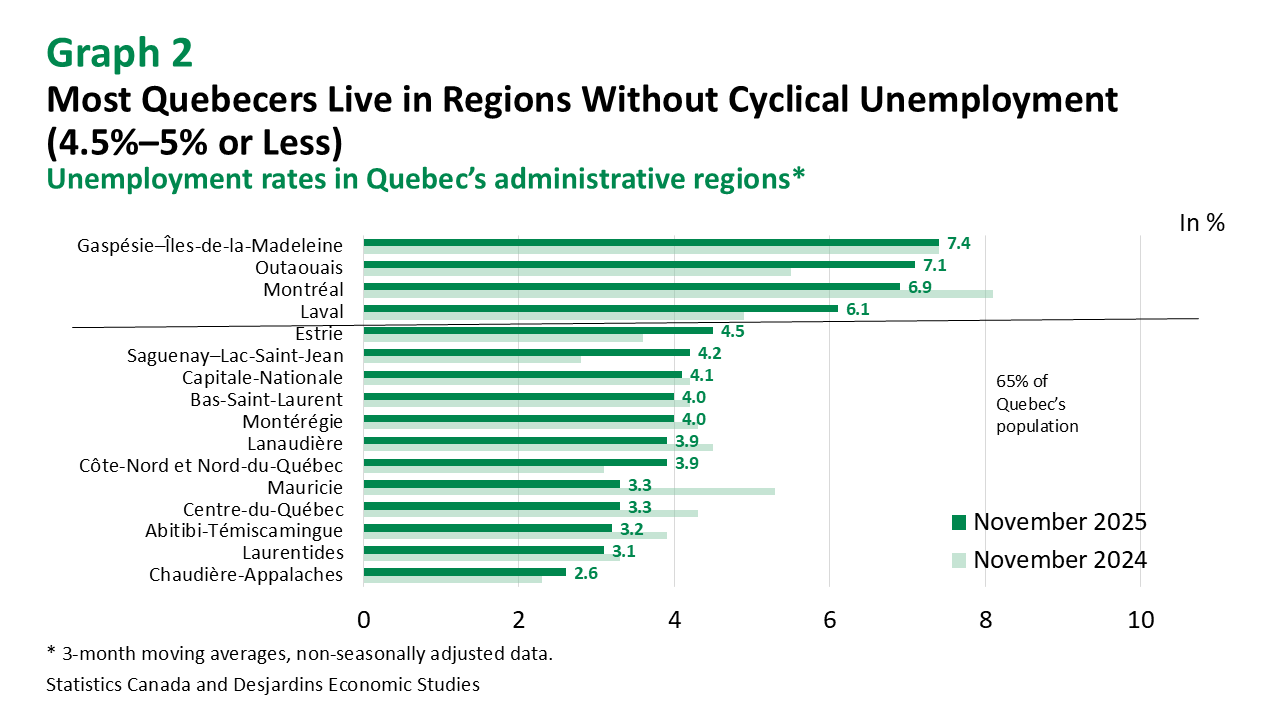 As of today, two-thirds of Quebec’s population live in an administrative region without cyclical unemployment, that is, unemployment linked to overall economic conditions (graph 2). In the current paradigm, a declining unemployment rate will not necessarily be a sign of economic strength.