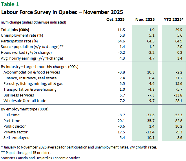 - The details were less favorable. Full-time employment posted a sharp decline of 37,600 positions in November and is down 53,300 since the start of the year. Private-sector employment also decreased, pushing its annual balance into negative territory (table 1).