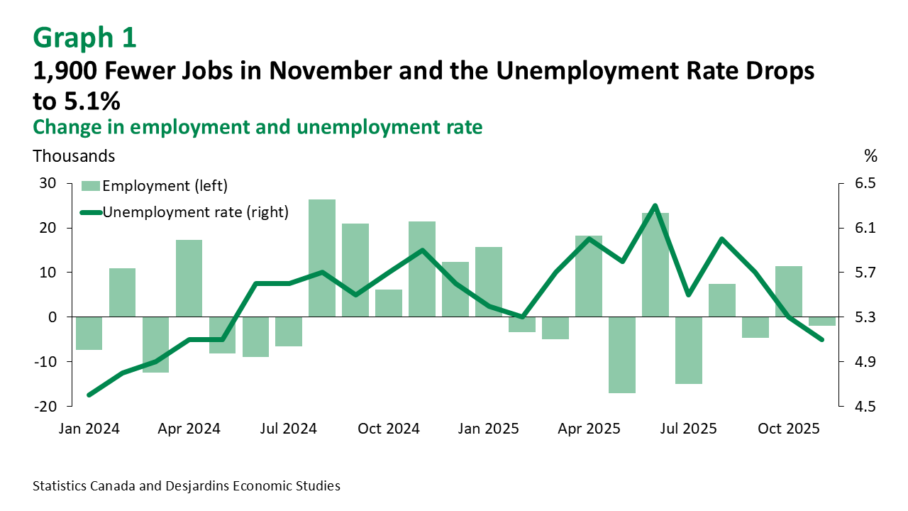 - The unemployment rate fell from 5.3% to 5.1%, remaining the lowest among the ten provinces. This decline is explained by a drop in the labour force (-11,200). The unemployment rate is now at its lowest level since May 2024.
