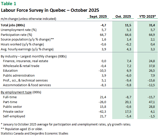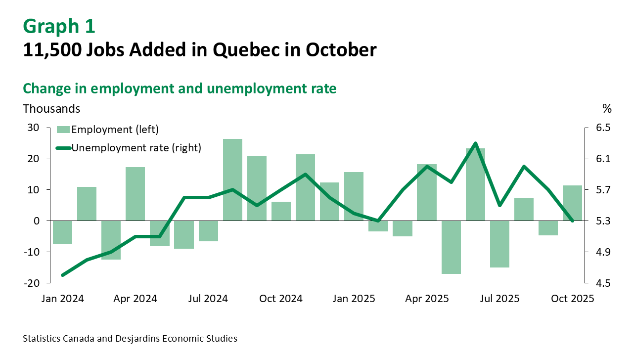 - Quebec added 11,500 jobs in October, offsetting the losses recorded in September (‑4,700). Since January, net job creation has reached 31,400 positions (graph 1).