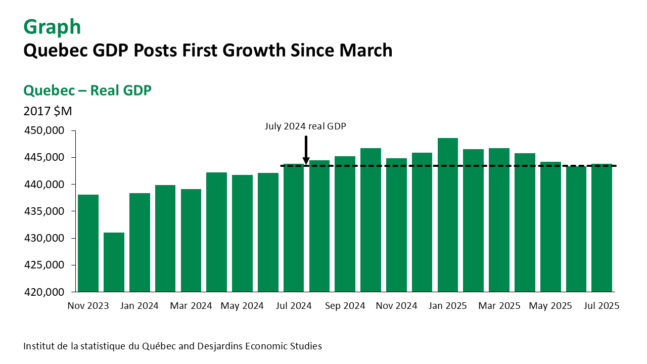 - Quebec’s real GDP posted its first gain since March, edging up 0.1% in July—a rebound weaker than that observed in Canada External link. (+0.2%). Cumulatively, GDP is up 1.0% compared to the first seven months of 2024.