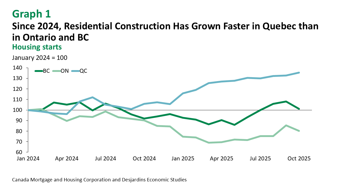 Residential construction has been the most resilient segment in Quebec since the start of the year. It has revved up sharply in the province, with housing starts rising 26% in the first three quarters of 2025 compared to the same period in 2024. This growth stands in sharp contrast with the other provinces. The national average was 6.0% for this period, or just 1.4% if we exclude Quebec. While housing starts appear to be rising again in Ontario and British Columbia, residential construction in both provinces was already so far behind Quebec’s that there’s still a significant lag (graph 1).