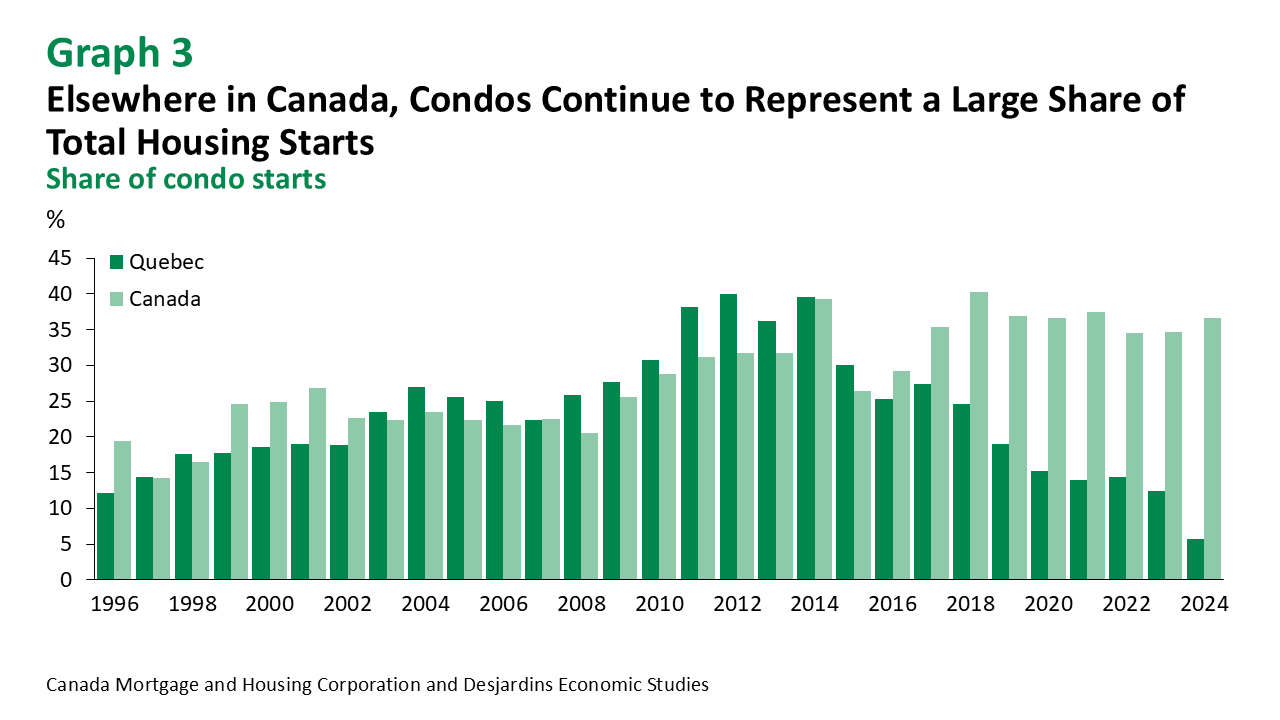 It’s hard to identify exactly why the situation in Quebec is so different from the rest of Canada, but several factors suggest it may be due to the wide array of measures taken by the provincial government, as well as the powers granted to municipalities. Most of this support has targeted the rental market, with nearly 80% of new units built in Quebec intended for rental (graph 2). In Ontario, this figure is closer to 40%. The prevalence of condos in Ontario and British Columbia partly explains Quebec’s stronger performance (graph 3), as purpose-built rentals don’t face the same construction challenges as condominiums.