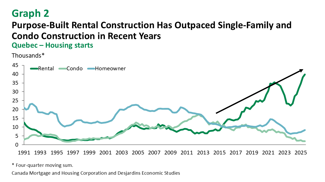 With so many new builds, supply in Quebec’s rental market is growing faster than in other segments. Supported by government incentives, rental housing stock rose nearly 4% in 2024—the biggest jump since 2014. Given that rental housing starts went up by more than 35% in the first nine months of 2025 compared to the same period last year, inventory in the rental market should grow even more this year.