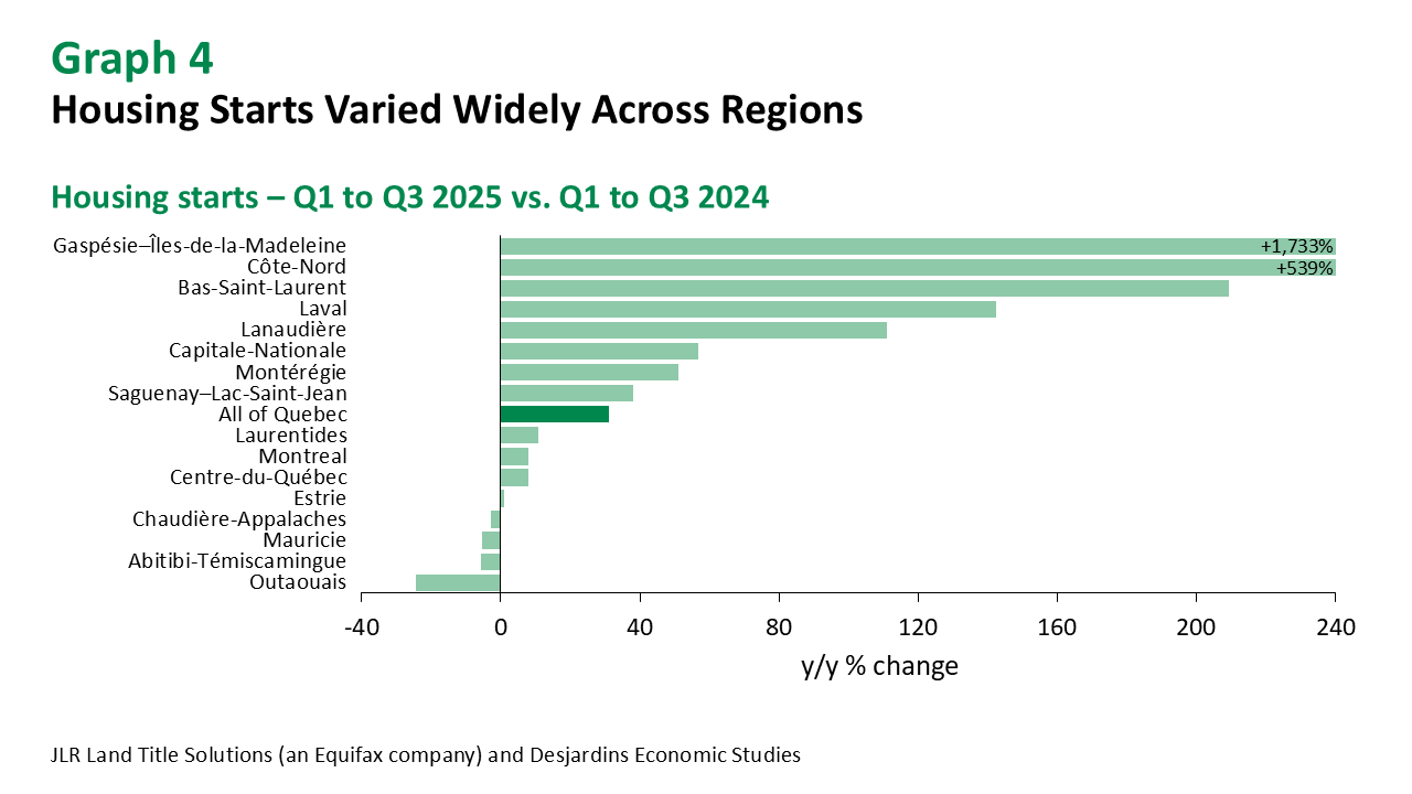 The powers that the Quebec government has granted to municipalities to fast-track approvals of projects that go against their own zoning bylaws have also had an impact. The Ministère des Affaires municipales et de l’Habitation reports that 21 cities used these powers in 2024, leading to the construction of 3,857 units. In 2025, housing starts rose significantly in several cities that have adopted similar measures (graph 4). But the impact of various municipal measures related to residential construction should fade as they expire. The provincial law granting these powers is also slated to expire in 2027.