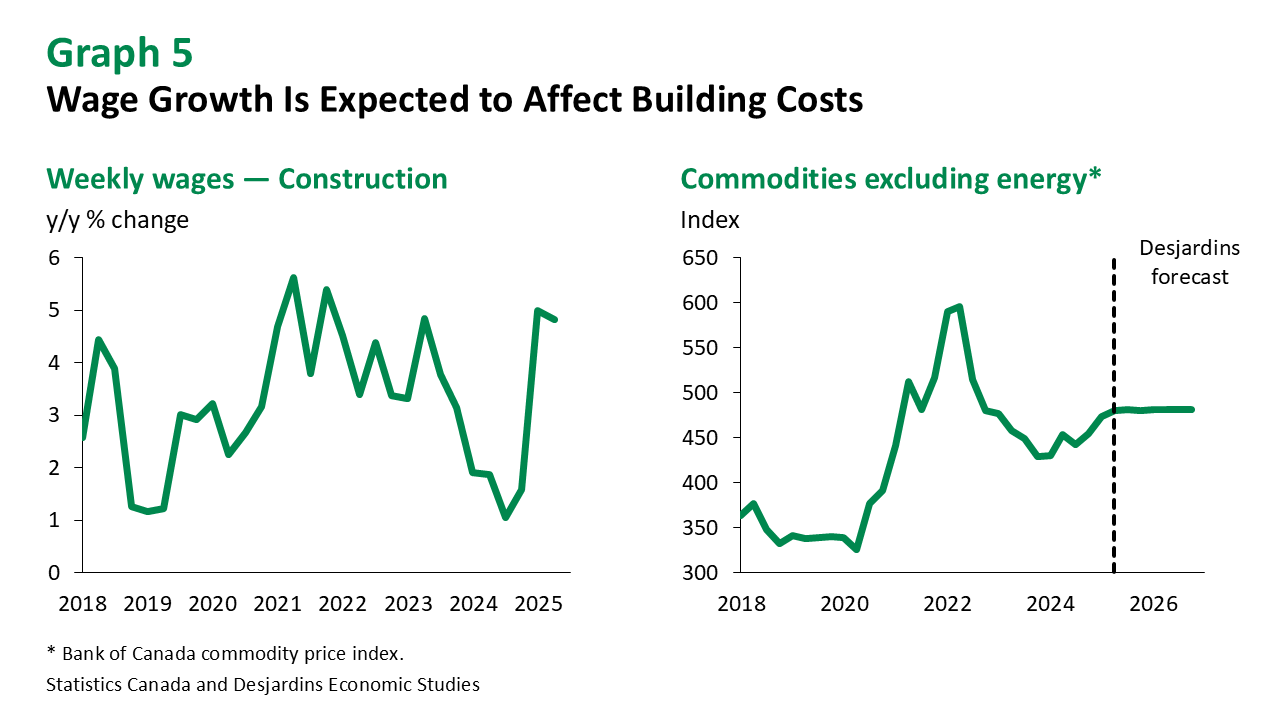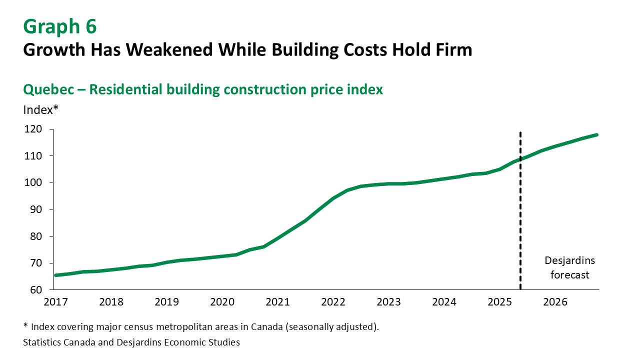 High construction costs External link. may also dampen activity. These costs have recently surged in Quebec, partly due to wage growth driven by strong labour demand and the renewal of collective agreements (graph 5). Although the cost of materials is expected to fall slightly, overall construction costs will remain elevated due to rising wages and strong competition for skilled workers. We see the residential building construction price index (BCPI) increasing by approximately 2% by the end of 2025, followed by a further 5% in 2026 (graph 6).