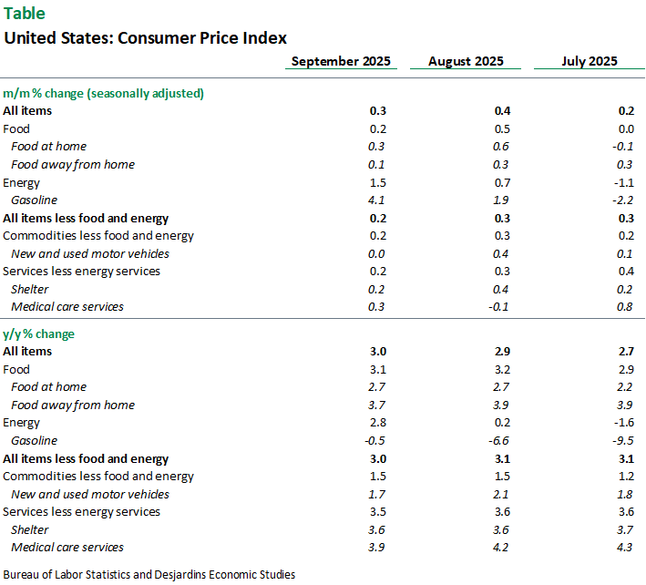 - The Consumer Price Index (CPI) rose by 0.3% in September, following a 0.4% increase in August. Core CPI, which excludes food and energy, grew by 0.2% in September, down from 0.3% the previous month. Price growth in September came in below consensus expectations, which were at 0.4%.