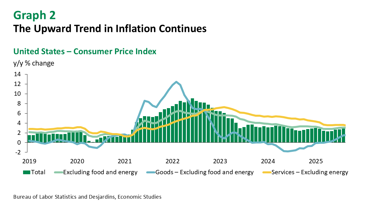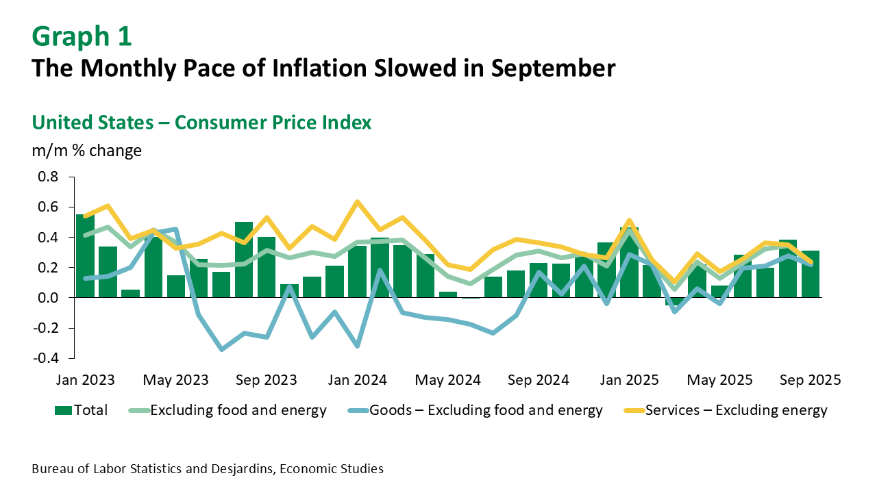 Meanwhile, there are some signs that tariff effects are beginning to filter through to consumer prices. Producer price indices have posted modest gains in recent months, and the CPI for goods excluding food and energy has followed a similar trajectory. Year-over-year, this component accelerated from 1.2% in July to 1.5% in September. That said, prices for goods were flat between August and September—a reassuring short-term development. Still, the broader trend remains concerning, and the impact of the trade war—limited so far—is expected to intensify in the coming months.