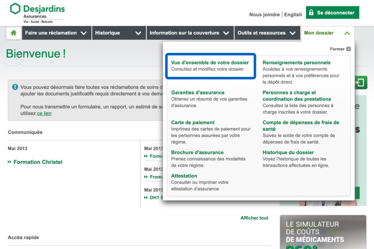 Connectez-vous au site sécurisé. Dans la page d’accueil, sélectionnez Mon dossier, puis le lien Vue d’ensemble de votre dossier.