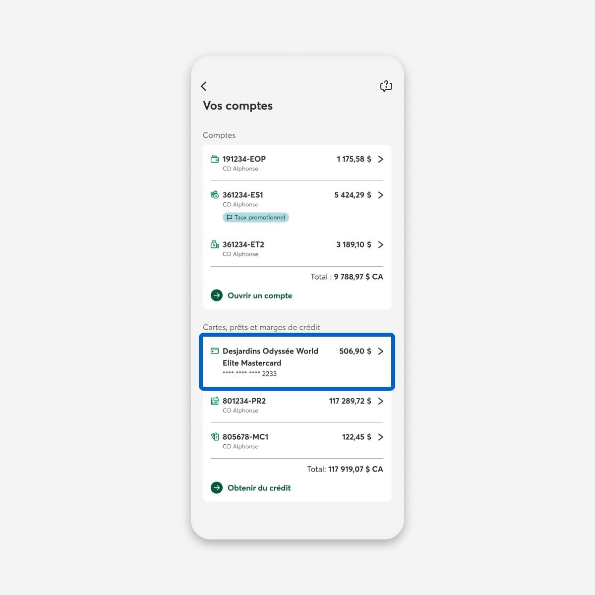 Dans la page Vos comptes, sous Cartes, prêts et marges de crédit, sélectionnez la carte de crédit pour laquelle vous désirez consulter le relevé de compte.