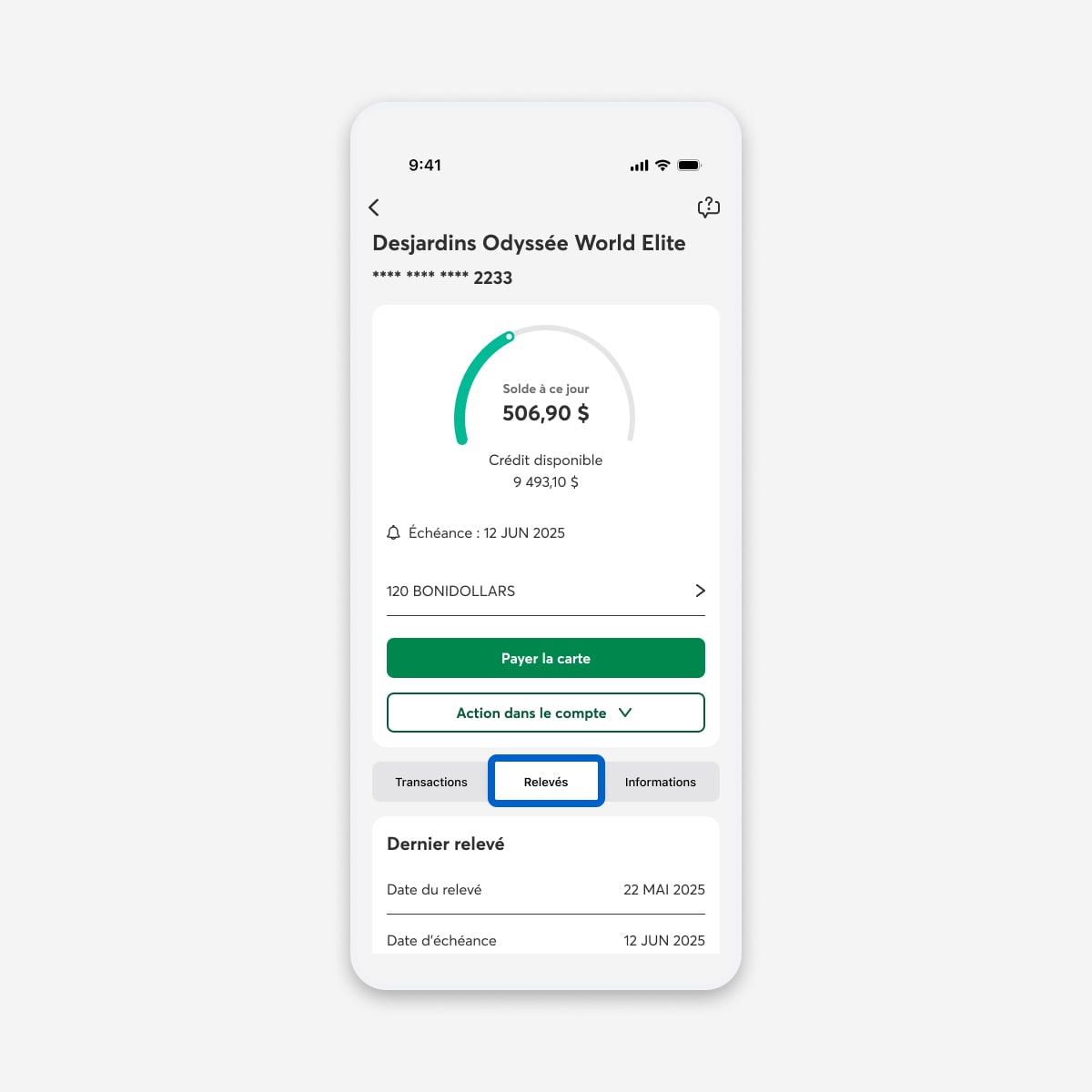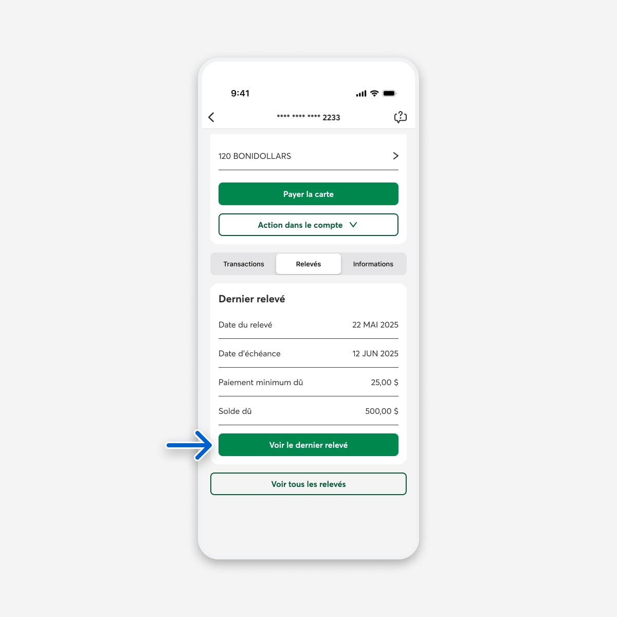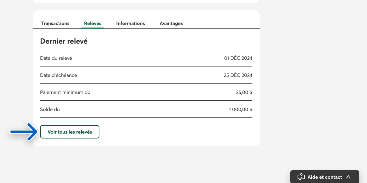 Dans la page de votre carte de crédit, sélectionnez le bouton Relevés.