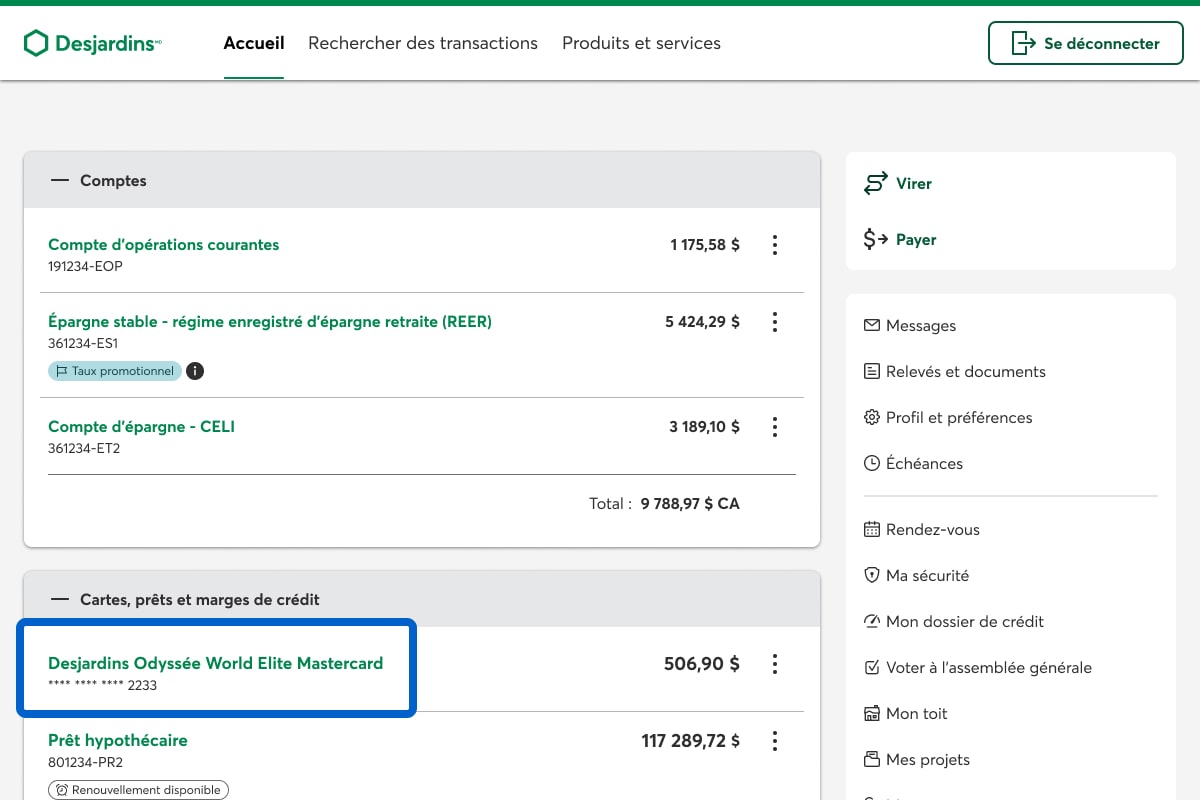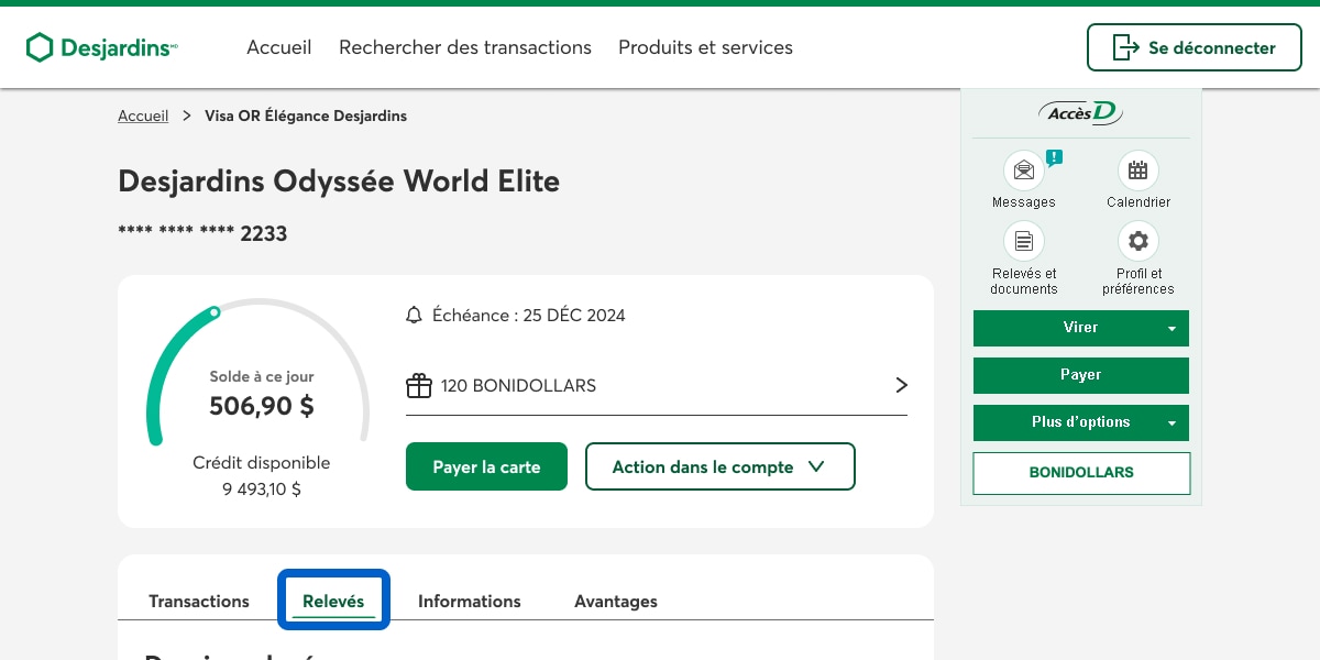 Pour consulter les relevés de compte de votre carte de crédit dans AccèsD, vous devez d'abord vous inscrire aux relevés et documents en ligne.