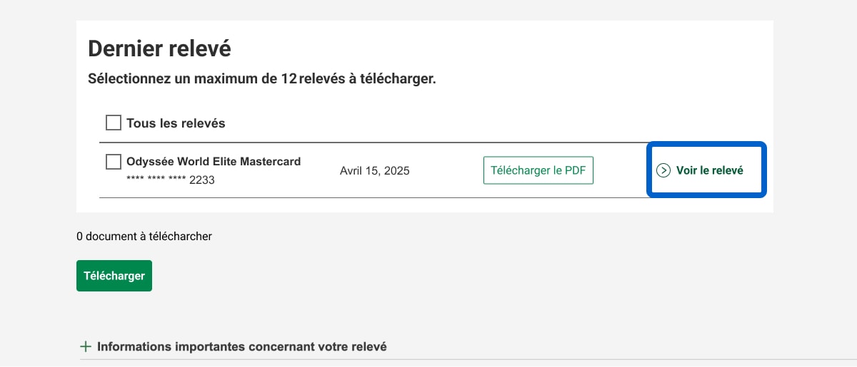 Dans la page Relevés de cartes de crédit et de cartes prépayées, sous la section Dernier relevé, sélectionnez le lien Voir le relevé.