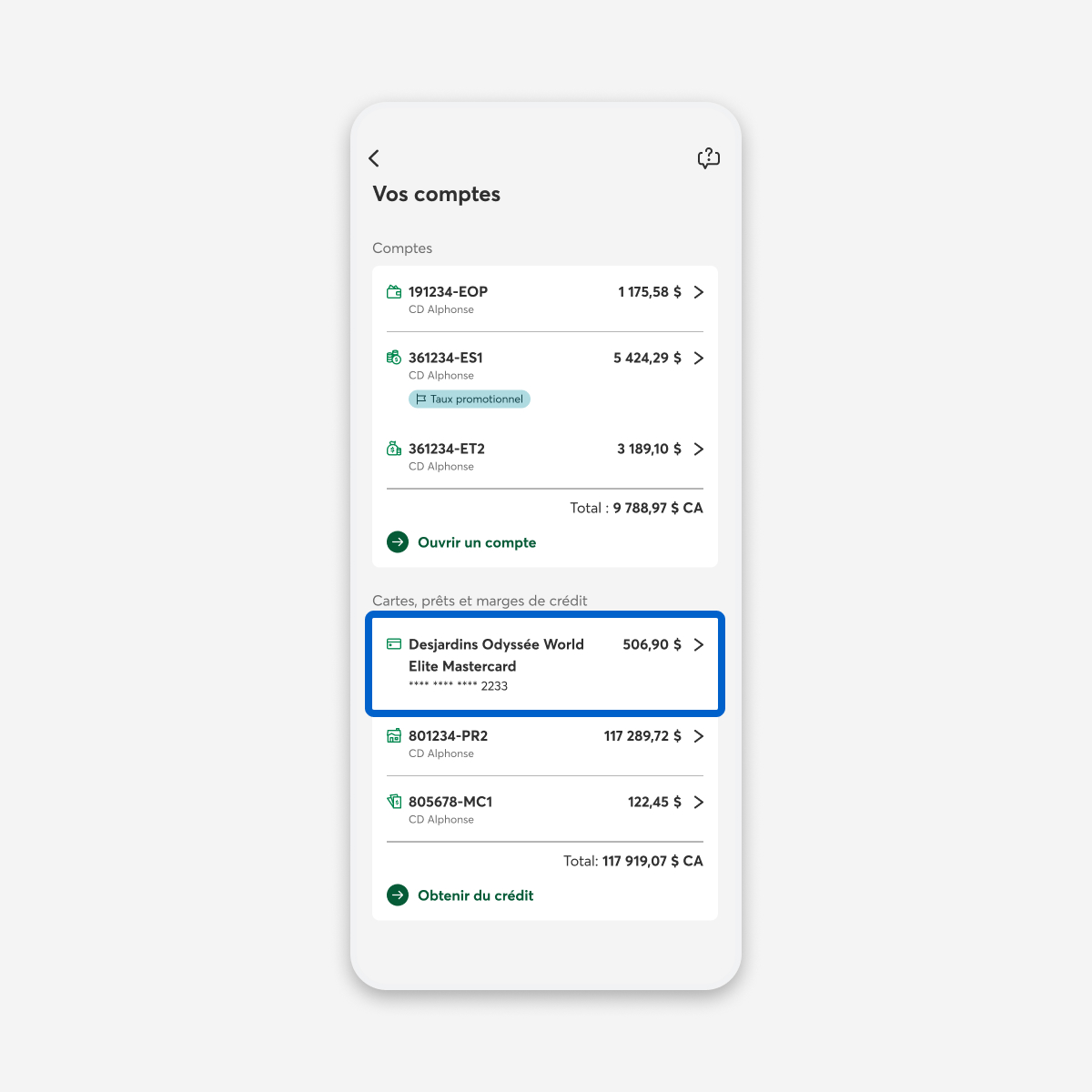 Dans la page Vos comptes, sous Cartes, prêts et marges de crédit, sélectionnez la carte de crédit pour laquelle vous voulez gérer la limite de crédit.