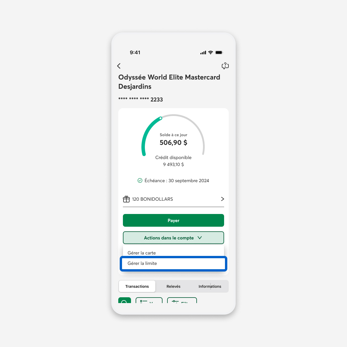 Gérez la limite de votre carte de crédit dans AccèsD à partir de votre appareil mobile ou de votre ordinateur si vous êtes l’unique détenteur ou détentrice de la carte. Sinon, contactez-nous par téléphone pour faire votre demande.