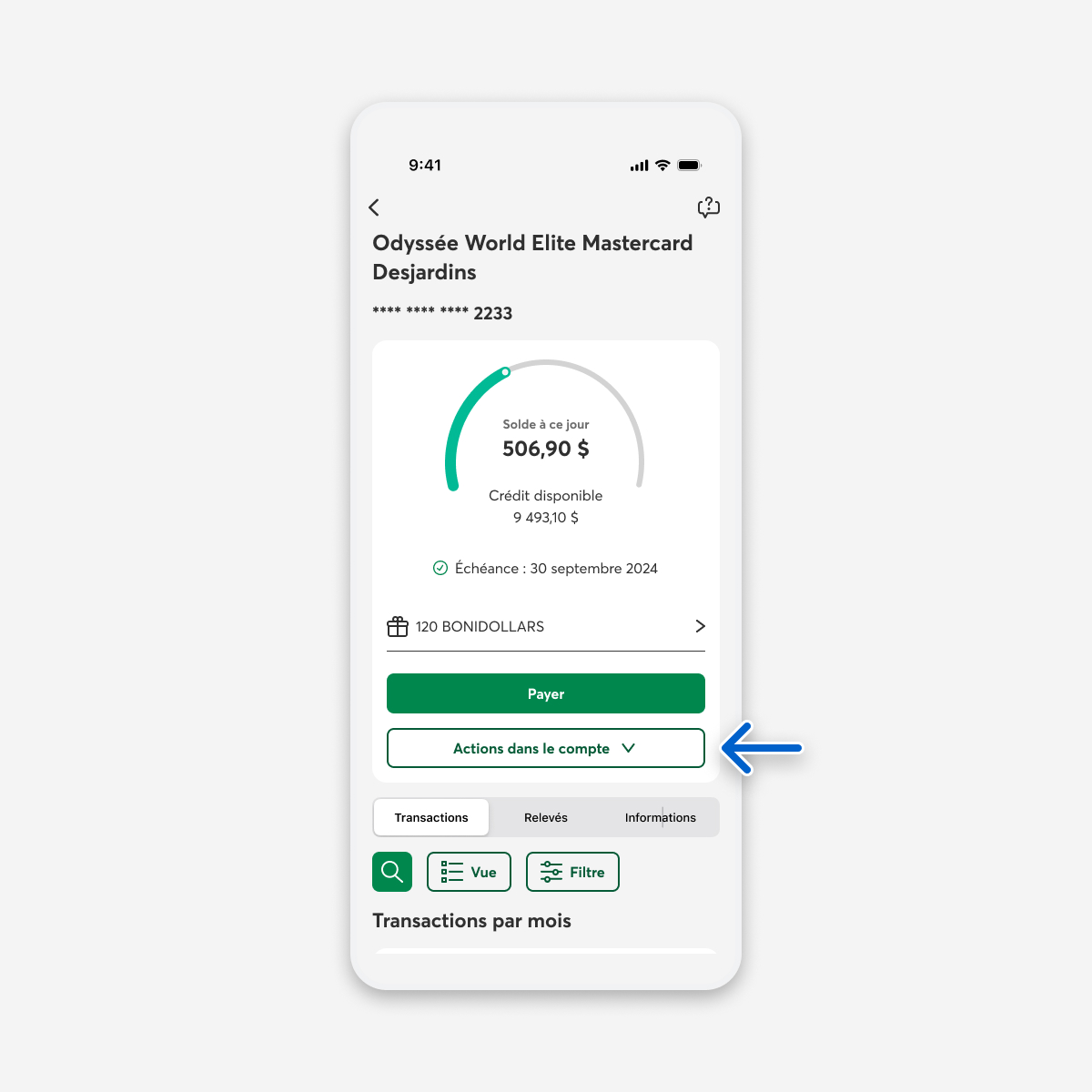 Dans la page de votre carte de crédit, sélectionnez le bouton Actions dans le compte.